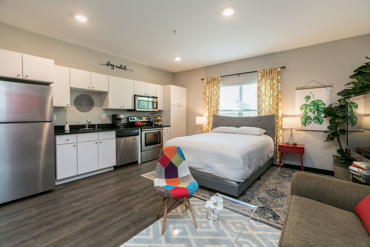 Unit features private 1-bedroom apartment w/ queen bed. Kitchenette w/microwave, small fridge and sink. Garage or off-street parking for 1 vehicle. Great large back yard for cornhole, gorilla bocce, frisbee or grounding on grass.