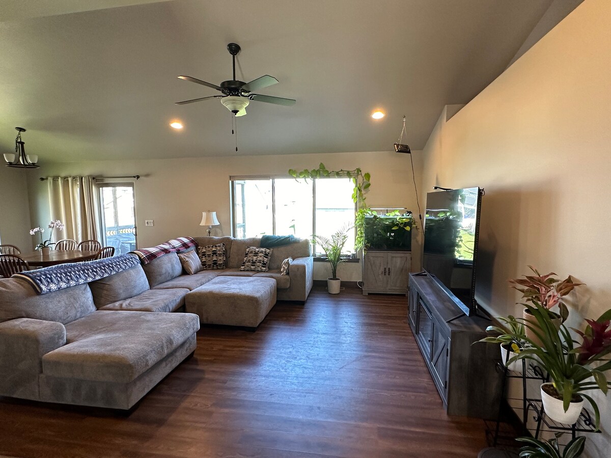 -- a living room with a large couch, a 50” smart flat TV, and a queen-size air mattress if needed,