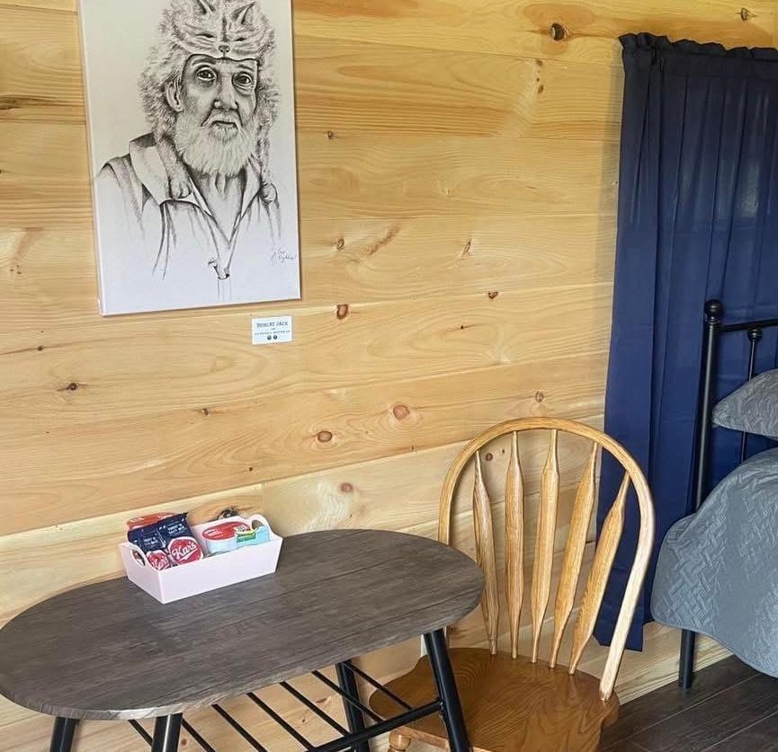 These cozy cabins sleep up to 4 people offering 1 full and two twin-size beds. Each cabin is equipped with a 40" Roku TV, full bathroom with a kitchenette with sink, microwave, coffee maker, refrigerator, heat and air conditioning, outdoor charcoal grill, picnic table, and fire pit. Bedding is provided, however, we do not provide towels, washcloths, or toiletries. Please limit two vehicles per cabin, pets are allowed on the campground but not inside the cabin. Cabins are smoke-free.