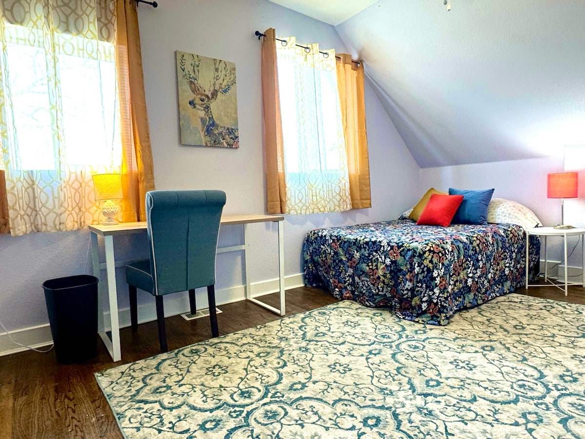 On the second floor is the bedroom with a queen bed and a full bathroom attached. Beyond that, there is the office and workspace with bright windows overlooking the park.