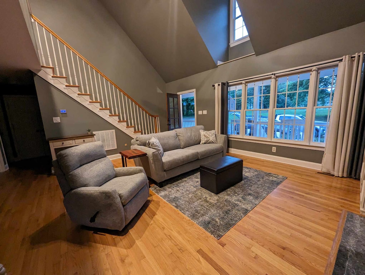 - "Comfortable, beautiful suoundings." - "The home is gorgeous inside and out. So many little details they added to make you feel at home. We will definitely be staying again" - "Nice no noise.saw 4 deer and a groundhog.would stay againThe owner text me back right away.Well stock and very clean"
