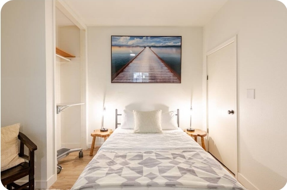 The bedroom is furnished with a queen size bed, a bench, closet, a laptop stand up desk, full size mirror, two nightstands with lamps and a barn door with a lock feature to be locked from the inside.