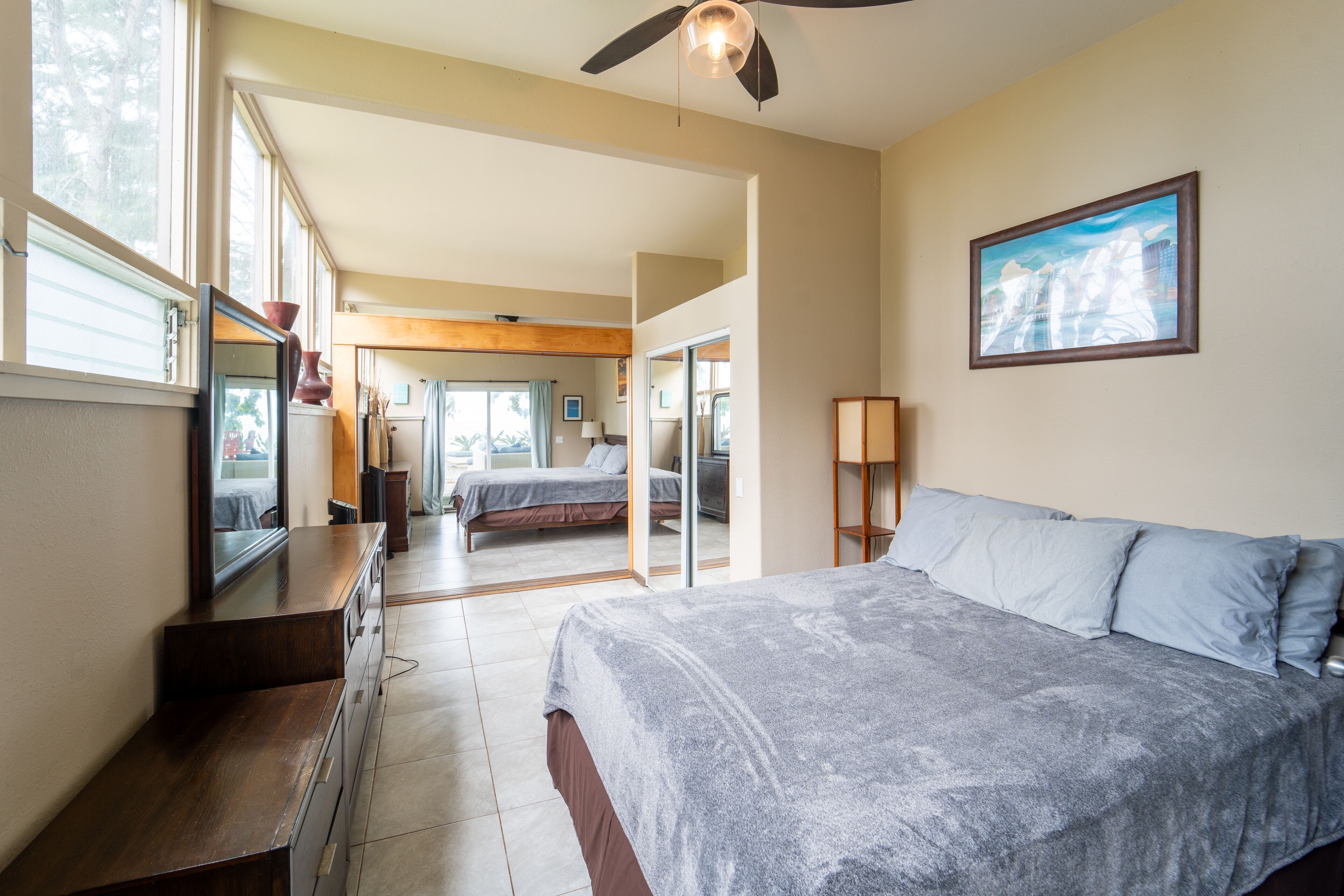 The dining and living room are adjacent to the kitchen and provide a perfect spot for family gatherings. The living room has a mounted flat screen smart TV. There is also a reading nook to curl up with a good book. Full bath is accessible from the living room. Continue down the hallway to the primary ensuite bedroom with king size bed. This room boasts a walk-in closet as well. To the left of the primary bedroom is the second guest room with bunk beds (Twin over full). Views from the back lanai offer spectacular mountain views.