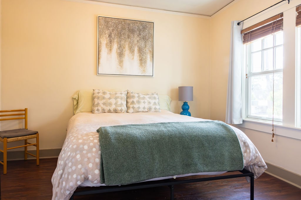 Spend the night on the dreamy full bed with a choice of soft or firm pillows and quality cotton sheets always cleaned in scent-free detergent. Slip into scrumptious bathrobes and enjoy fluffy towels. Help yourself to coffee or tea in the morning and enjoy it on the front porch that sits a half story above the sidewalk below. If you feel like eating in, store your groceries or takeout in the small fridge and use the microwave, and/or air fryer/toaster.