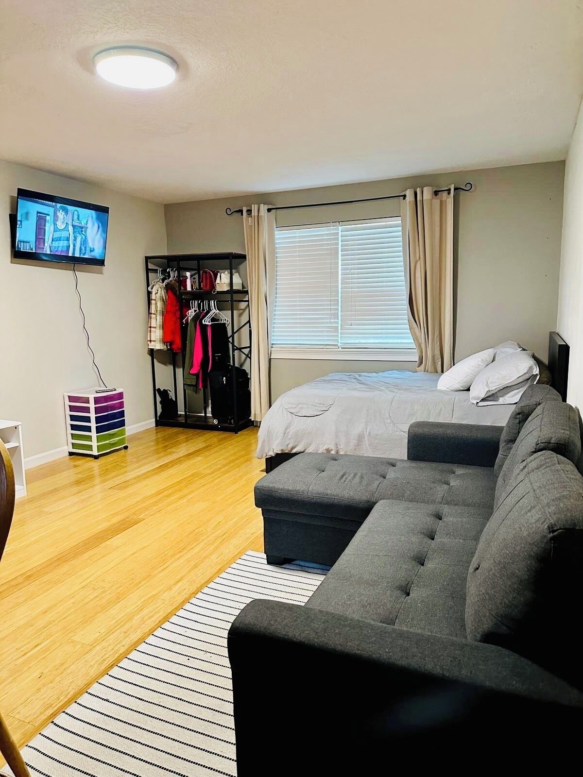 The cozy and relaxed bedroom area is flooded with natural light from new windows, featuring a comfortable mattress and fluffy pillows. Rainy days are ideal for cuddling up and watching movies on the 65” LED flat-screen TV, with cable, Netflix access, and blazing-fast WiFi for streaming.