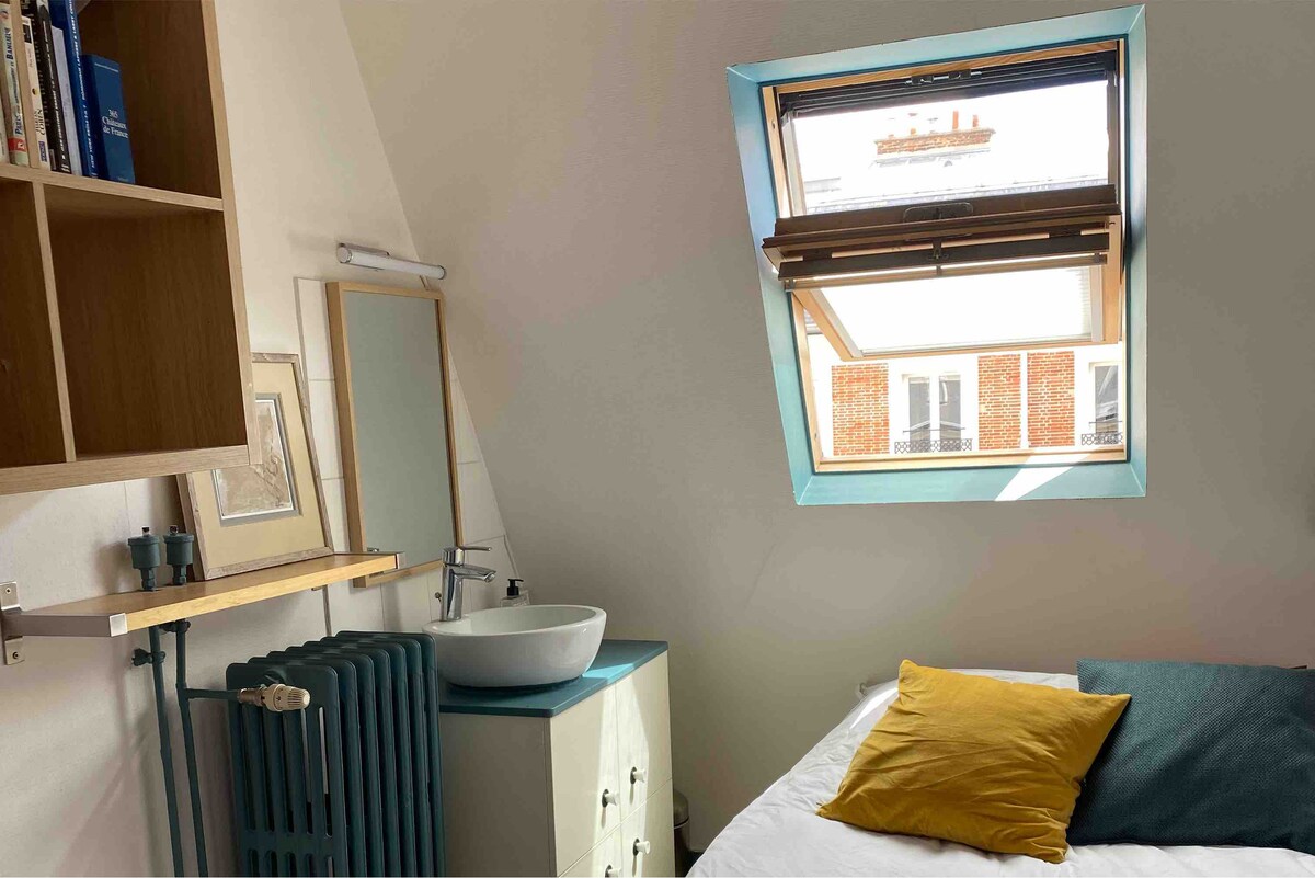Small bedroom on the 5th floor of a Hausmannian building, there is no elevator! The place doesn't have a shower or kitchen, so it's suitable for a short stay.