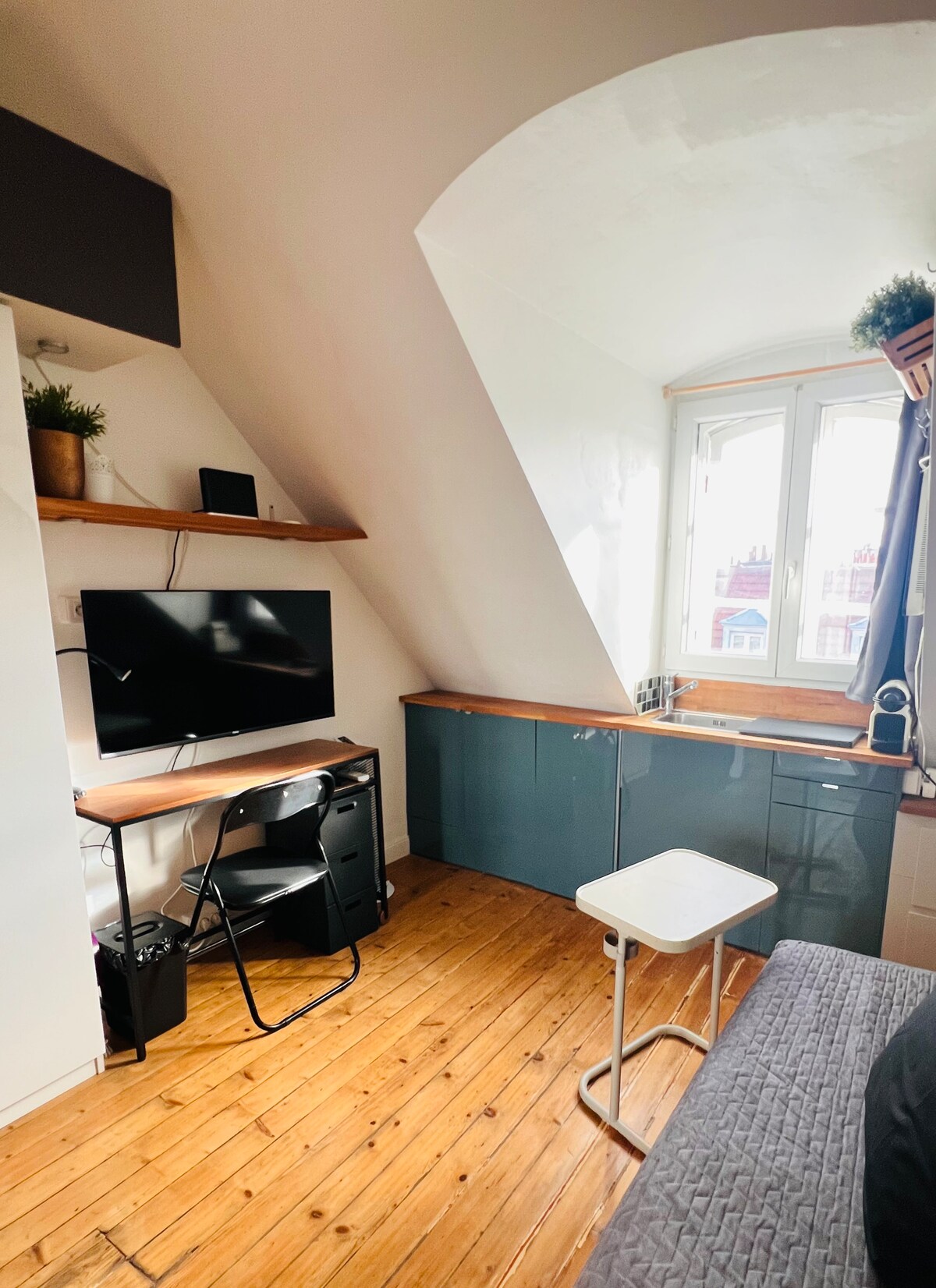 In a typical Parisian street, facing the metro, between Place de Clichy, and Gare Saint Lazare, near Opéra. pretty furnished 9.5m2, is on the top floor with beautiful view on the street and Parisian monuments.