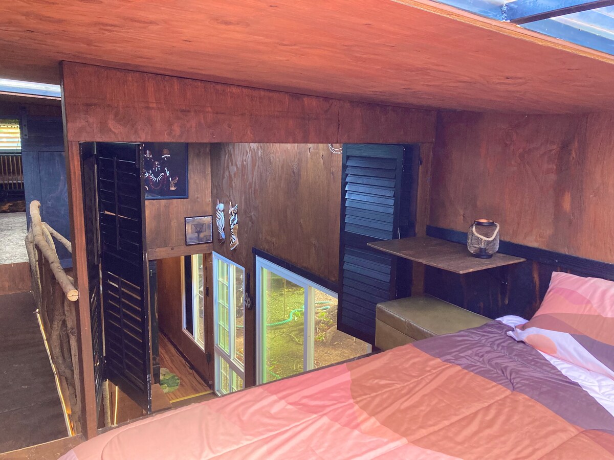 This tent comes with one king bed and solar powered string lights. You will stay on a fenced plot of land that is adjacent to rows of banana trees and other tropical plants. There are gorgeous mountain views throughout the day and a picturesque "golden hour". 3 bathrooms are conveniently located on-site, each equipped with a sink, shower, and toilet.