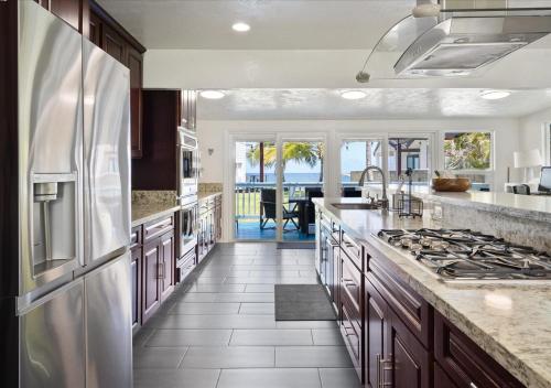 This oceanfront estate is gated and private, with a Palm Tree lined driveway leading to the 6,000 square foot estate. The property is comprised of a main house and adjacent guest house above the garage. The main house features 3 bedrooms and 3.5 baths. All 3 bedrooms have en suite full bathrooms along with private ocean view decks. The main house is surrounded by expansive oceanfront decks with amazing ocean views, perfect for lounging or dining outdoors. The large guest house studio is equipped with a full kitchen and full bathroom. This space has two queen beds and two futons. This estate also contains a game room in the basement of the main house for your enjoyment.