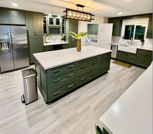 The kitchen is fully furnished with brand new stainless steel appliances which include Refrigerator, Dishwasher, Double Oven, gas range and Microwave. Keurig Coffee Brewing System and kitchen supplies including pots, pans, bake ware and dishes are also provided.