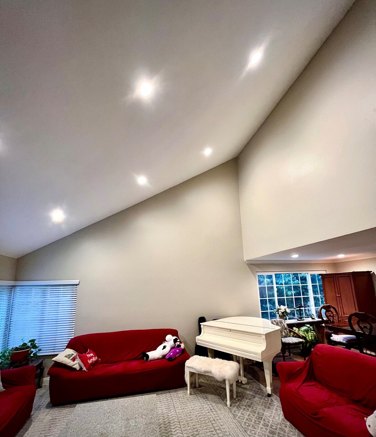 The white-carpeted modern interior is offset by black lacquer furniture and lots of mirrors reflecting it's contemporary spacious feel. The combined living and dining room is immersed in dimmed LED lights setting the tone for an intimate evening at home at the 6-person dining table, or relaxing on the sofas in front of the fireplace. Or brighten the scene for a colorful night of entertainment in the family room in front of the 75" 8K TV connected to all available DirecTV channels and explosive sound emanating from the 7.2.2 surround sound system. If music is your preference the whole-home audio-video system will whisk away the worries of the day.