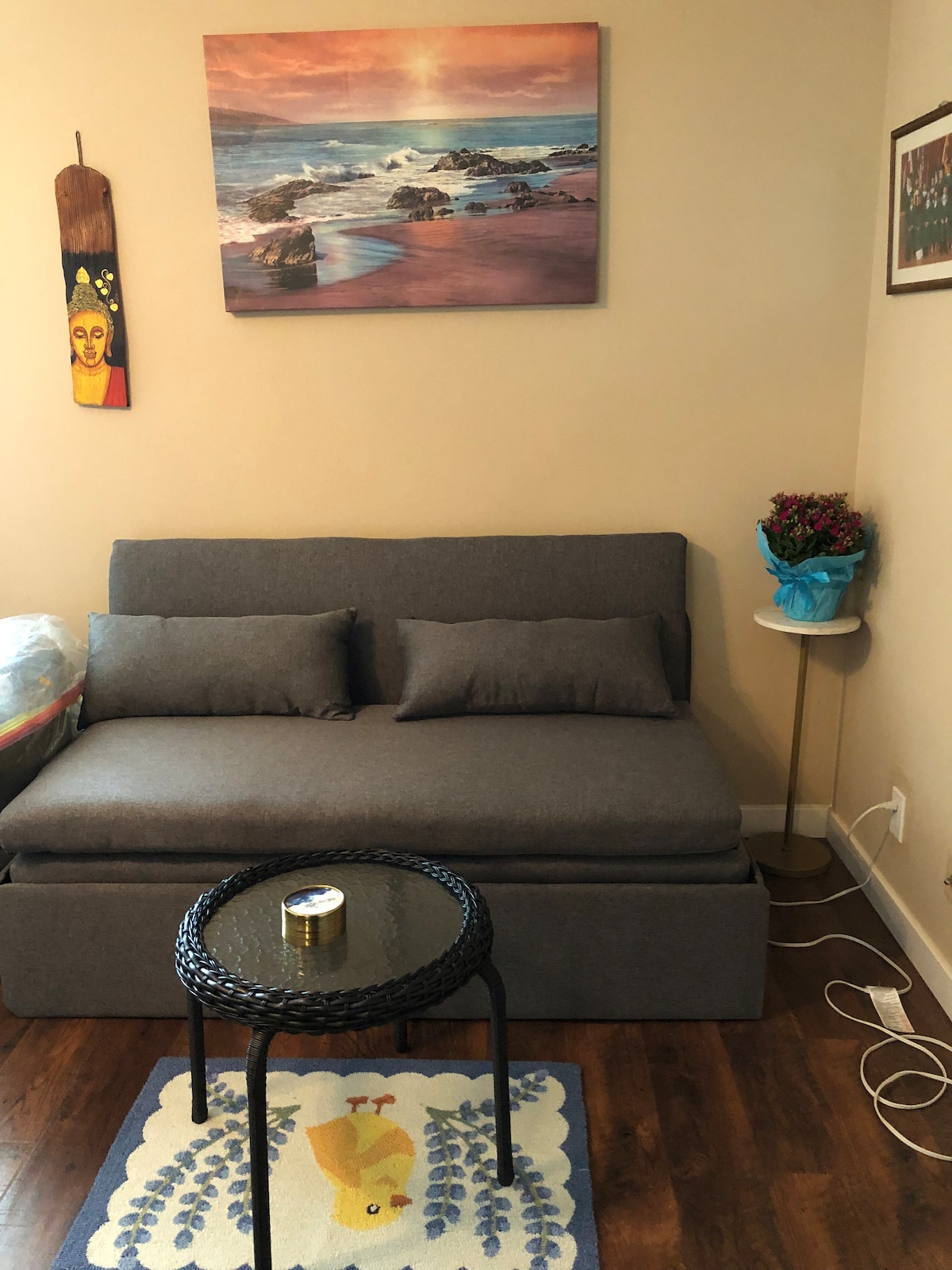 As you step into this beautiful residence, you'll be greeted by an open and airy atmosphere, with tasteful decor and plenty of natural light. The room, designed with your comfort in mind, features a plush full sized pull out bed, that doubles as a cozy seating area, and ample storage space for your belongings. Whether you're a solo traveler, a couple seeking a romantic getaway, or friends embarking on an adventure, our room provides the perfect setting for a memorable stay.