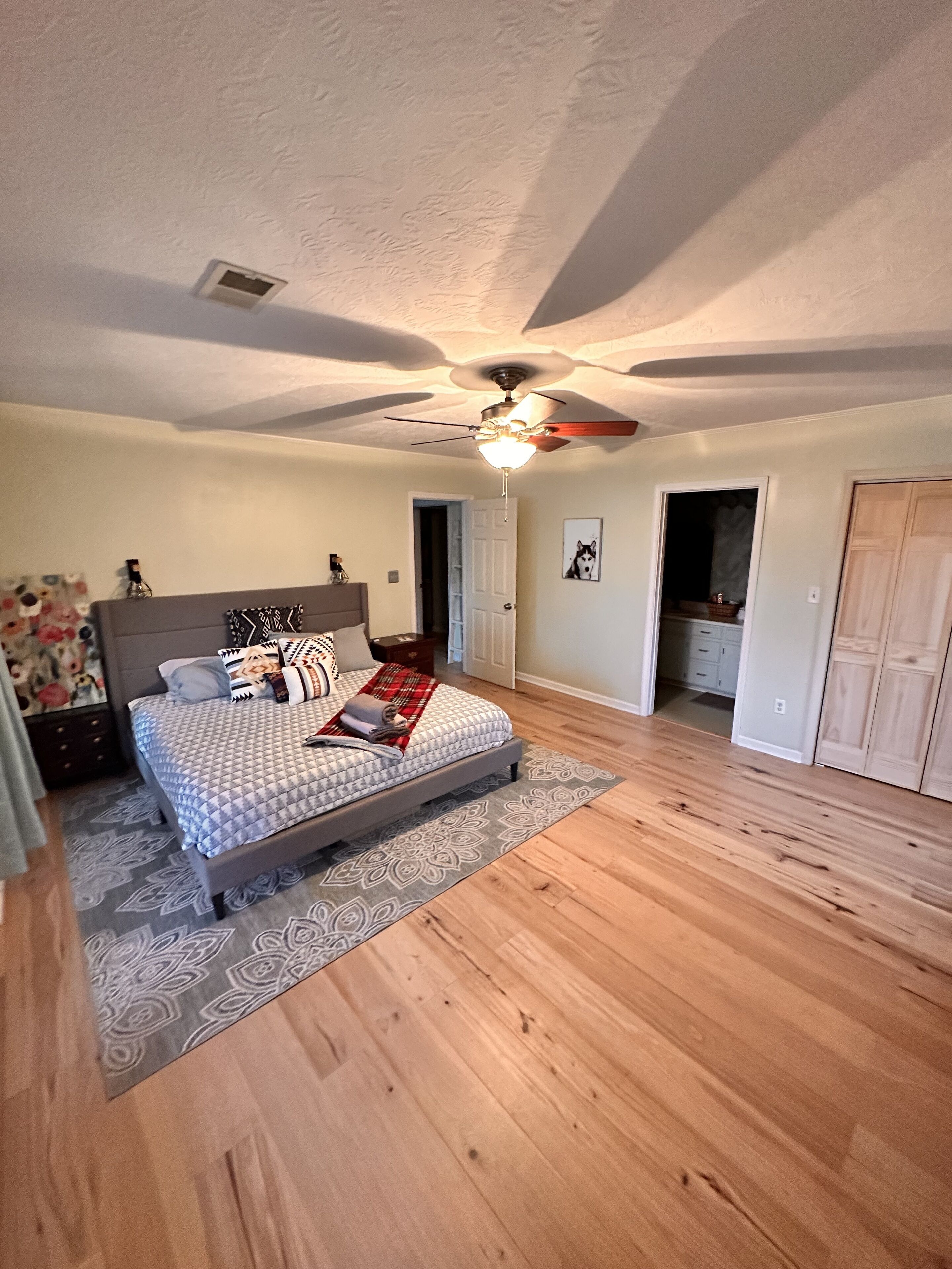 The master bedroom features a King size tempur-pedic matress in a Low-Country Rice Bed along with European Heirloom Armoire and dresser. A large accessible bathroom is just off the hallway next to main bedroom.