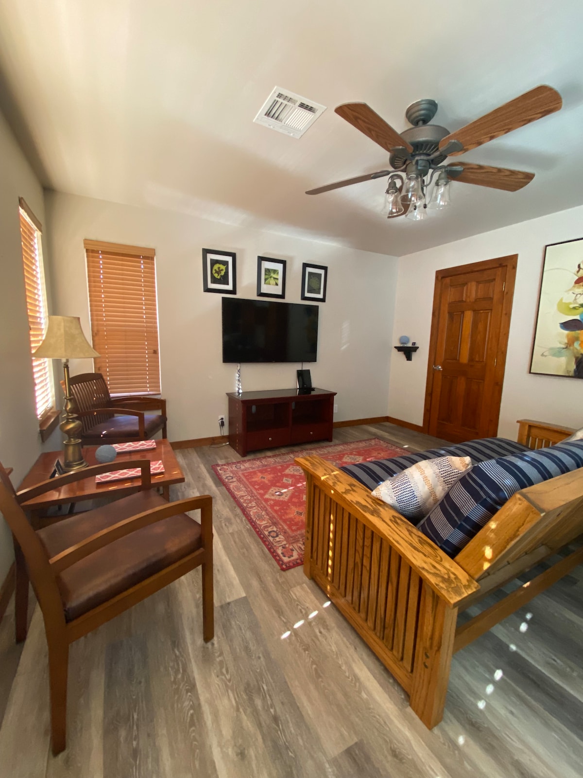 The upstairs is a family suite with 2 bedrooms and a luxury bathroom. The 1st bedroom has 1 king bed, and 1 queen bed. The 2nd bedrooms has 2 twin beds and 1 full/double bed. The bathroom features a walk-in shower, jetted oversized tub, and double vanities. The upstairs has a separate air conditioner, heater and ceiling fan, as well as carpeted floors to help muffle the sound of little running feet. Beautiful views of our 5 acre resort can be seen out the large windows or enjoyed from the covered private balcony.