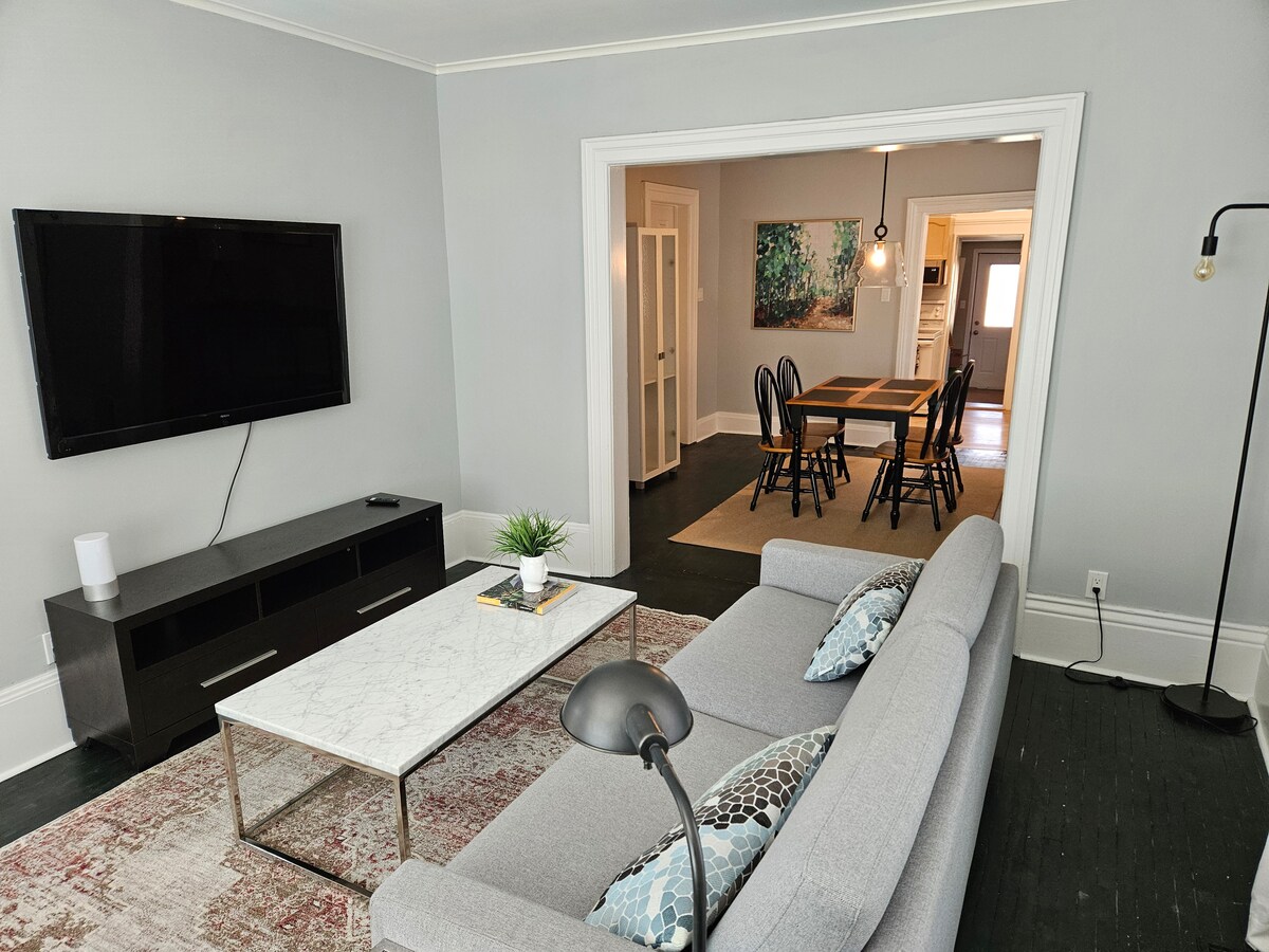 Living room and kitchen (coffee, tea, reheating ok) cooking not permitted. Front patio/hammock in the back yard also accessible.