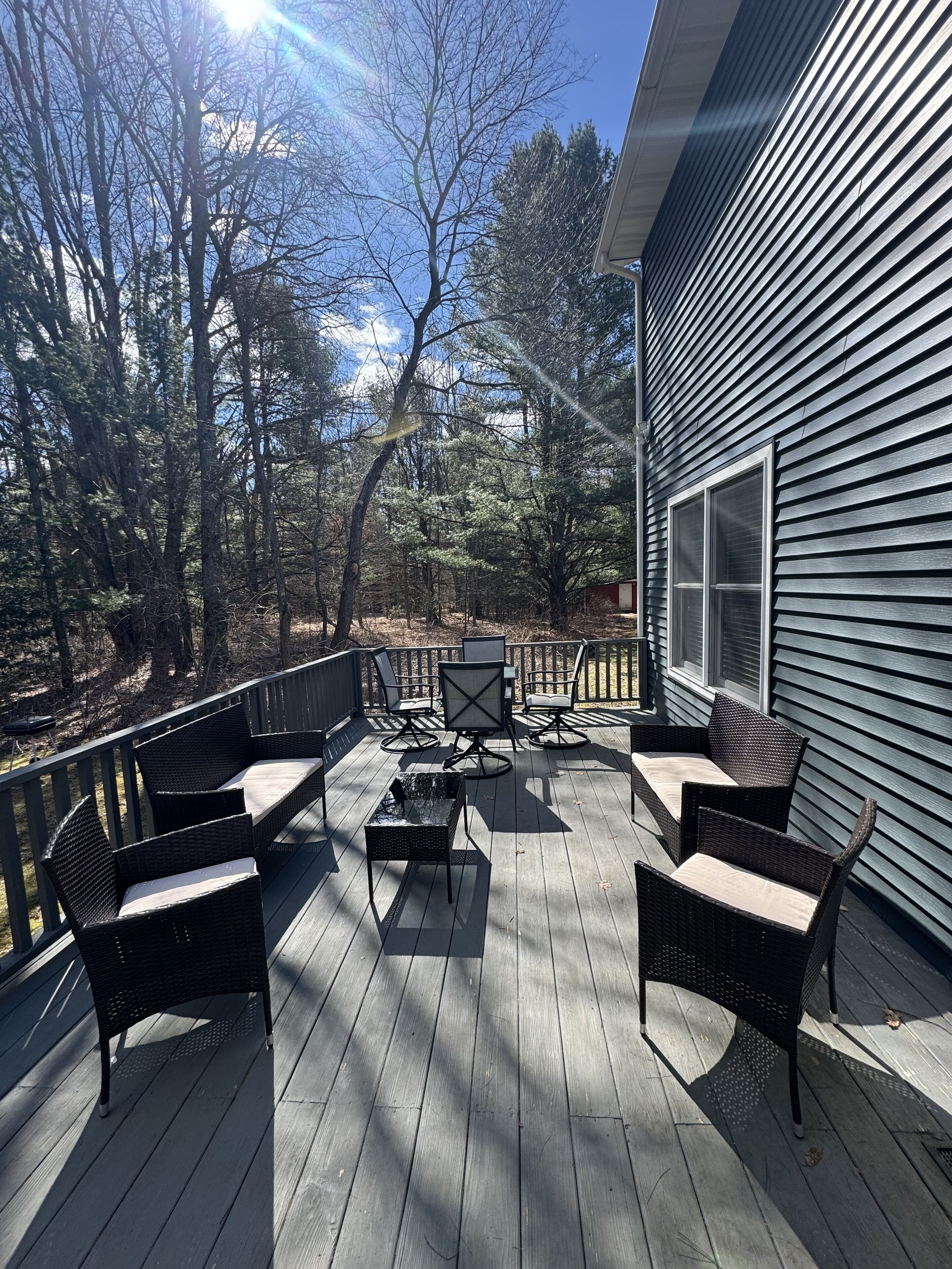 Outside you will enjoy plenty of space to hang out whether playing games during the day or taking in the stars at night around the fire pit. Across the street there is a small shared lake access to swim at or hang out by the water. Not far down the road there is a boat launch if you want to bring your boat. In the winter we are 20mins from Caberfae or 30mins to Crystal Mountain for some skiing and we are conveniently located to hop on snowmobile trails. There is a nice table and chairs with a grill on the back deck and chairs for sitting around the fire.