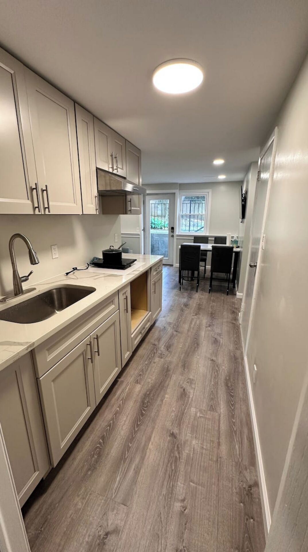 - Enjoy your meals on the large white quartz island that comfortably seats 4.