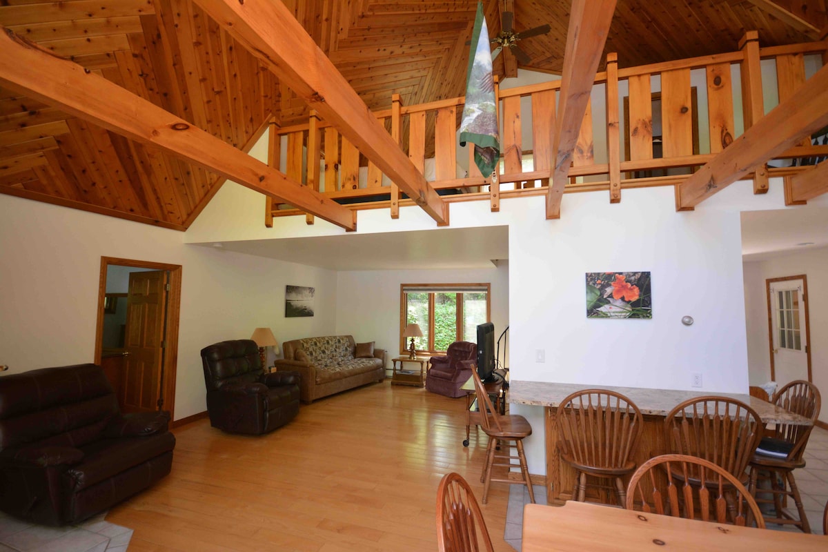 Introducing LeGrand Hideaway located on 5 acres of land near the beautiful American Legion State forest. Reserve a peaceful getaway at Stepaway Vacation Rentals! LeGrand Hideaway is a breathtaking year round cabin with 2 bedrooms, 1 full bathroom and a cozy loft. Easily accommodating up to 4 guests max , the cabin glows with natural light with cathedral ceilings in the living room providing a spacious, relaxing area to gather with family and friends.