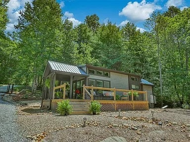 Can modern and rustic co-exist? Are the Mountains calling YOU? We say “Yes!” Completely updated 4 bedroom, 3 full bath house with all the modern touches you’ve come to expect but still loads of original mill-work and mountain character. The 2 acre lot is very private with two creeks and a waterfall for wading around. One entrance to the house is on ground level, only 2 steps up to indoors! Yet, you feel truly in the mountains at over 3,200 ft. elevation! Located midway between Brevard and Cashiers in a private community with two lakes for swimming, fishing, canoeing and kayaking. Relax and dine outside on either screen porch or back deck (remote controlled awning covers deck.) Newly added screen porch with sectional sofa, heaters to ward off the chill, large screen TV and full dining table. Gather around the campfire with family and friends. Enjoy s'mores at the picnic table with umbrella.
