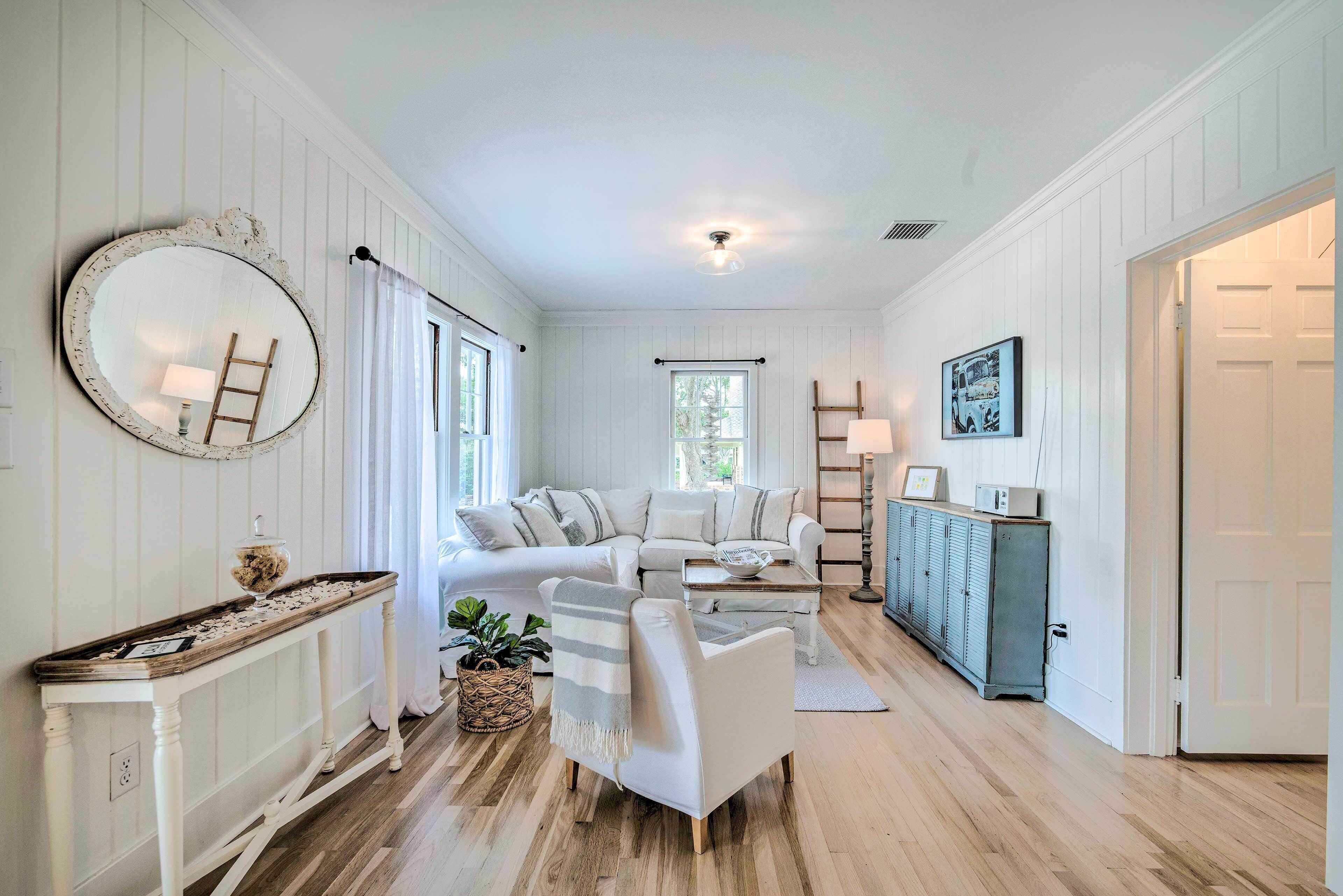 Relax in a cozy home that’s walking distance from Eaton’s Beach on Lake Weir with beach access. 2 bedroom and 2 bathroom. Three TVs. Dedicated work area with a desk. Washer and dryer. Screened in patio with a TV. Very