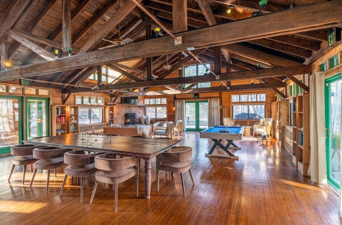 A thrilling pool table for friendly competitions, a large dining table for communal gatherings, and a well-equipped entertainment nook.