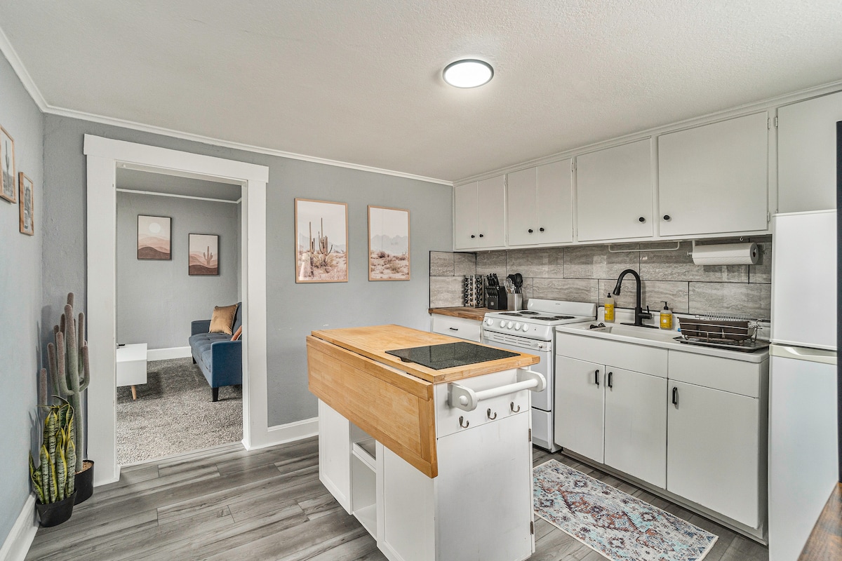 In downtown Lees Summit, our 2-bed, 1-bath Airbnb blends modern design with historic charm. Luxurious king-size bed in the master, a twin trundle bed in the guest room with dedicated workspace. Stylish bathroom with modern fixtures. Perfectly located for dining, shopping, and entertainment. Cozy living space, well-equipped kitchen. Fast WiFi. Your ideal home away from home in vibrant downtown. Book now for an unforgettable Lee’s Summit adventure!