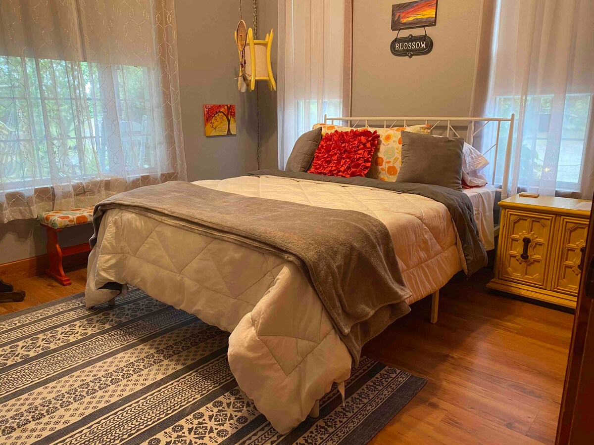 Sanitized and always clean! Our funky and comfortable room greets you with happiness and will Serenade you to la-la land. Lay your head down in this lovely country home setting and all your troubles will melt away. Comfy new queen size bed and full bathroom for your use. Well appointed room, exclusively yours a full bath, snacks and beverage center plus Continental breakfast included. Limited internet service due to satellite WiFi.