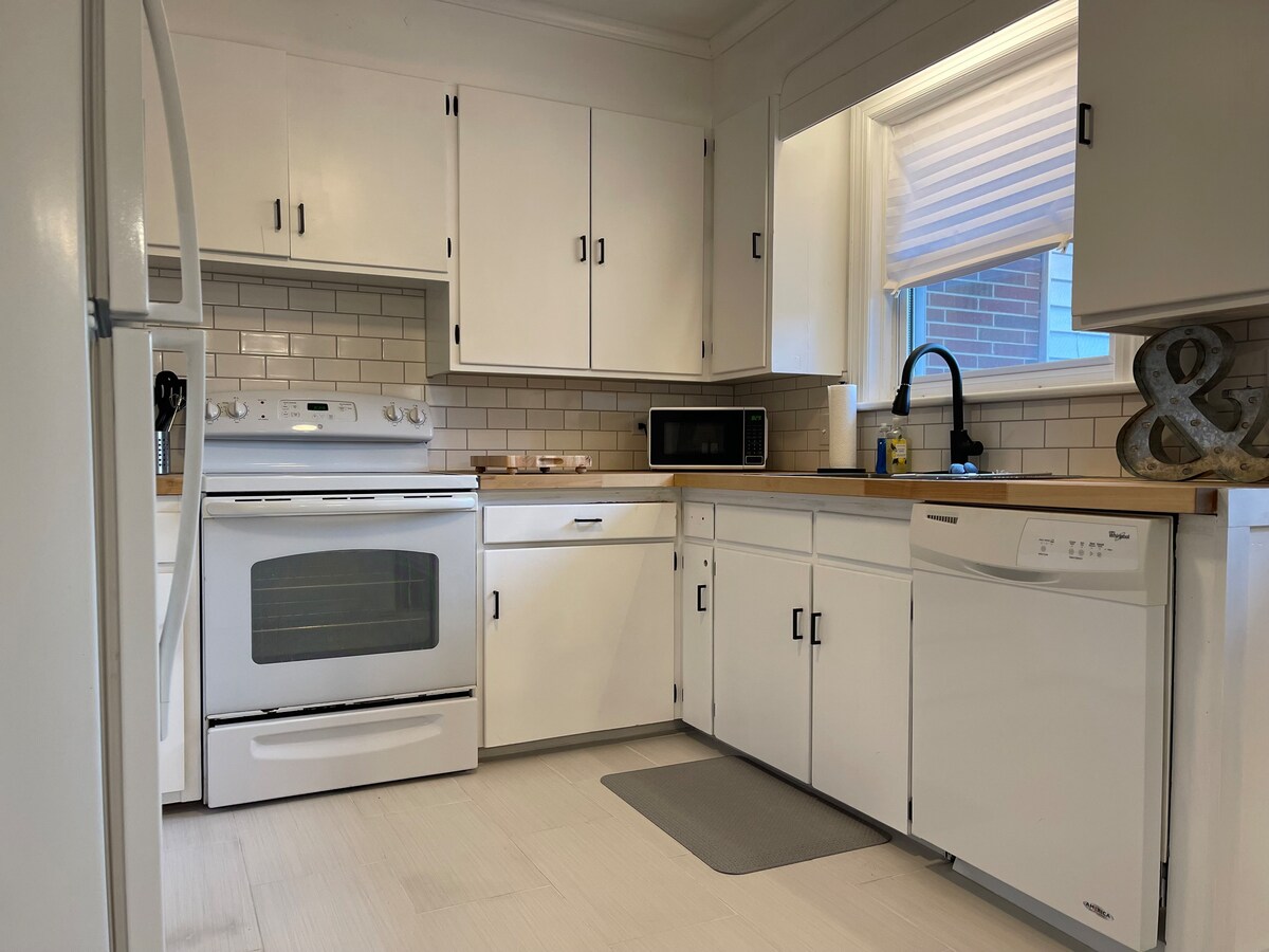 In the home the original pine hardwood floors have been restored to provide a clean modern feel. The cozy living room has lots of windows that provide natural light and a ceiling fan. The pine floors flow into the bedroom featuring Queen size bed with closet and ceiling fans. The new eat in kitchen is perfect for cooking and entertaining. You will love cooking with our new black stainless appliances including a stove, built-in microwave, French door refrigerator, and dishwasher. With subway tile, open shelving, and touches from yesterday the kitchen is bound to blow you away. The home is complete with new Samsung front load washer and dryer. The kitchen and bathroom feature tile floors. The bathroom has a large tub with shower, sink vanity and toilet.