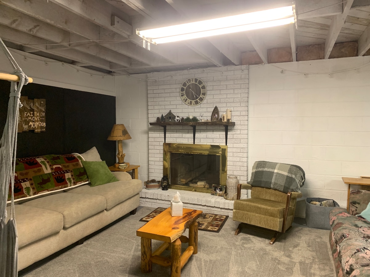 Up for adventure? Try out the VINTAGE Tall PAUL BUNYAN Queen bed! (We do have bench risers tucked underneath each side of the bed if needed--see pictures). Bedroom also has an electric fireplace with fun lighting options and remote and a 32" TV with Roku remote.