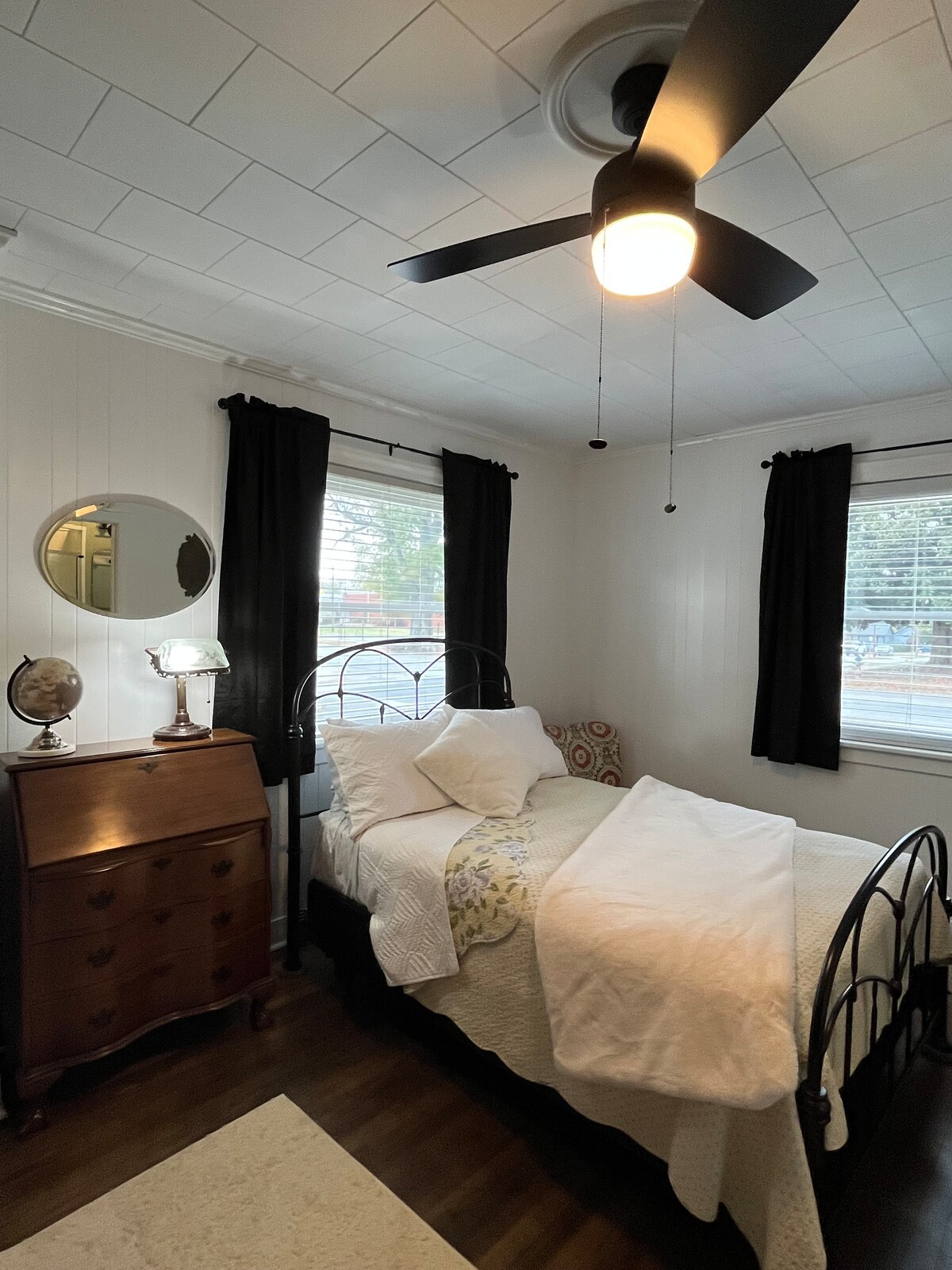 The cottage has a sitting area with a sofa, chair and ottoman along with a kitchenette containing a small refrigerator, sink, microwave and coffee maker. The rear area contains the sleeping area (queen bed) and a bathroom with a walk-in shower. The space is designed for 1 or 2 short term guests, but the sofa can be used as a bed if you are bringing a child. There is a small front porch and guests are welcome to enjoy the entire backyard. Please be aware that heating/cooling comes from a unit on the wall. If you are a light sleeper who might be bothered by the on and off noise, the cottage may not work for you.