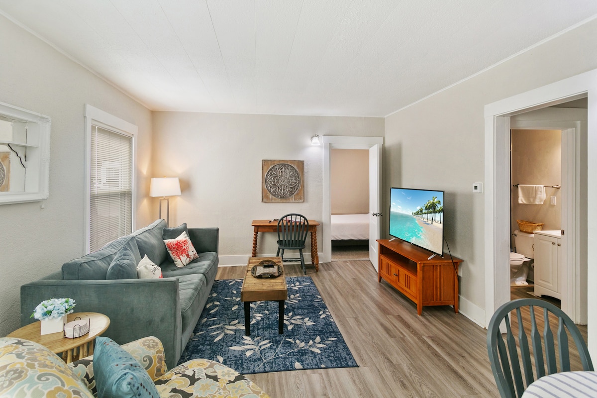 2ND FLOOR | 2 BEDROOMS | LARGE PRIVATE OFFICE, QUANIT CHEERFUL | RENOVATED w/NEW FLOORS | BEAUTY KITCHEN w/EATING AREA, LIVING ROOM w/55” ROKU TV, MASTER BEDROOM (QUEEN), w/ROKU TV, BEDROOM 2 (QUEEN DAYBED OR TWIN), BEAUTIFUL ONE FULL BATH WITH TUB/SHOWER/CLOSET, LAUNDRY RM w/GAS DRYER/WASHER, LG REAR CLOSET/STORAGE.
