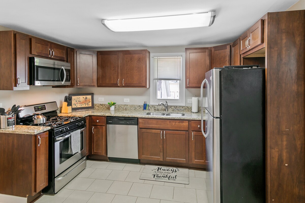 3 bedroom/1 bathroom apartment walking distance to amazing downtown Libertyville area with multiple restaurants, shops and the Metra train station. Hardwood floors, granite counter tops, SS appliances, tile surround tub/shower, Fully equipped Kitchen, Keurig Coffee maker w/ Pods, Crock Pot Slow Cooker, Roku TV, and Wi-fi. Each bedroom has a king Size bed. Sofa sleeper in Living room.