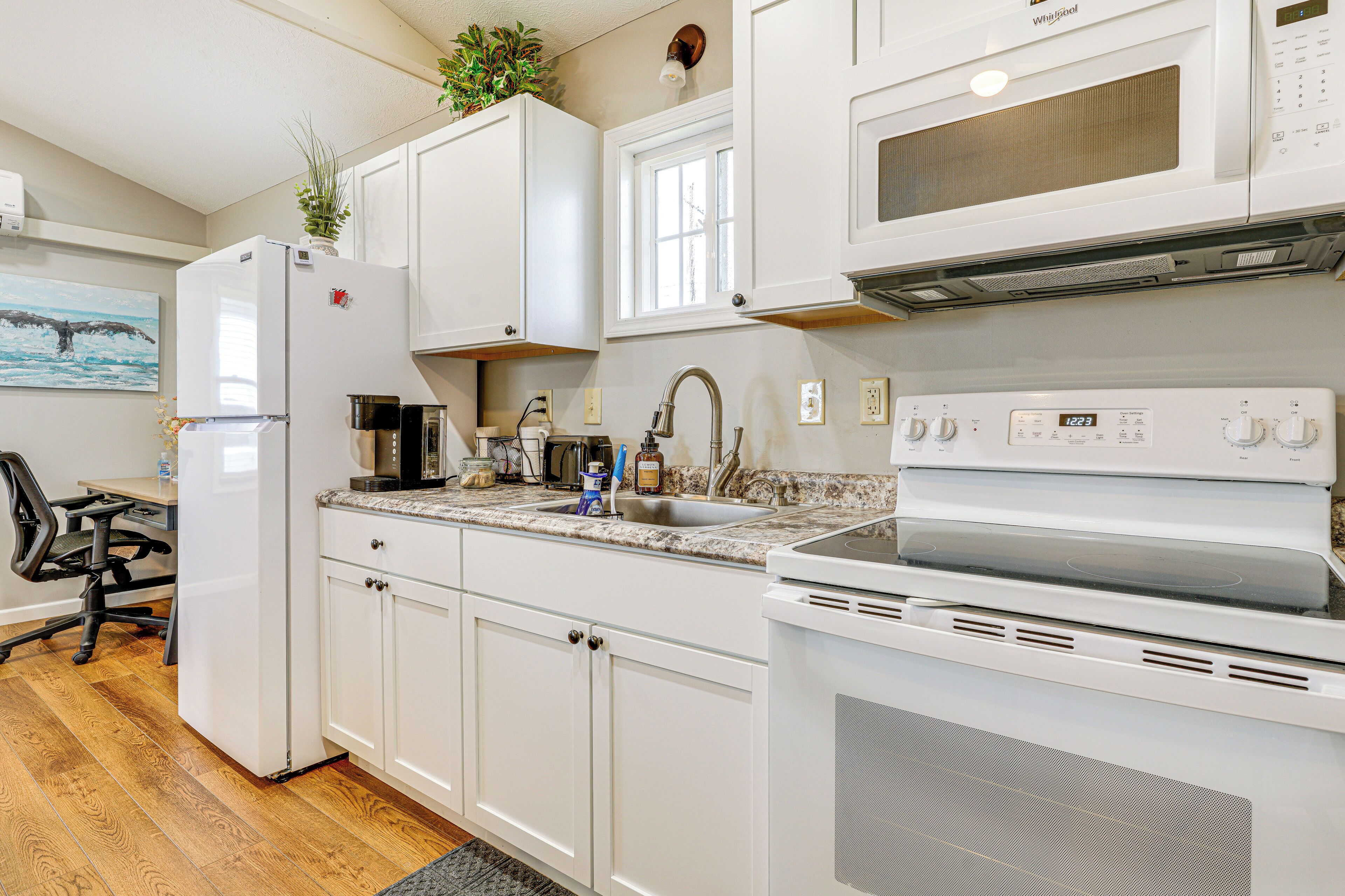 The fully stocked kitchen has everything you need—cookware, dishes, coffee maker, and more. Whether you’re cooking a full meal or just heating up leftovers, you’re covered.