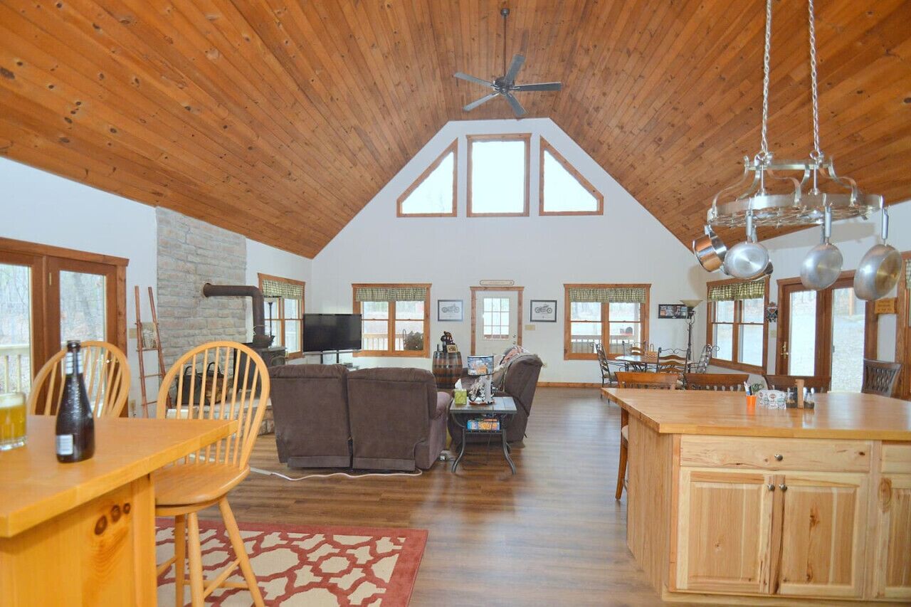 INDOOR LIVING: Smart TV w/ cable, 2 wood-burning stoves (wood provided), dining table, vaulted ceilings, ceiling fans, books, board games, ping pong table, children's books/games