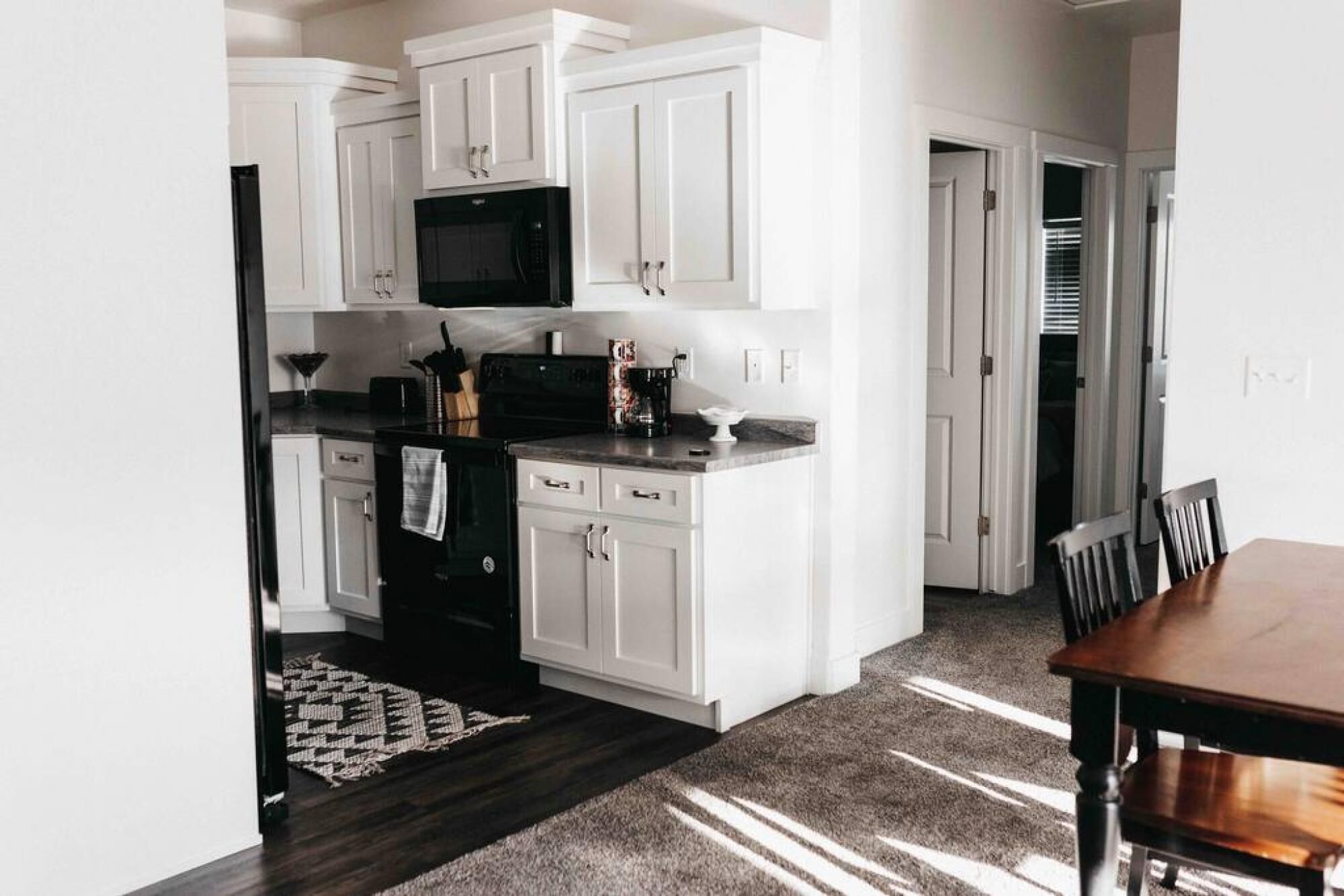 The kitchen includes everything you will need to prepare and serve meals, a counter with bar stools, and a round dining table. You will find several kitchen appliances available including a Keurig Coffee maker (a limited amount K-pods are provided).