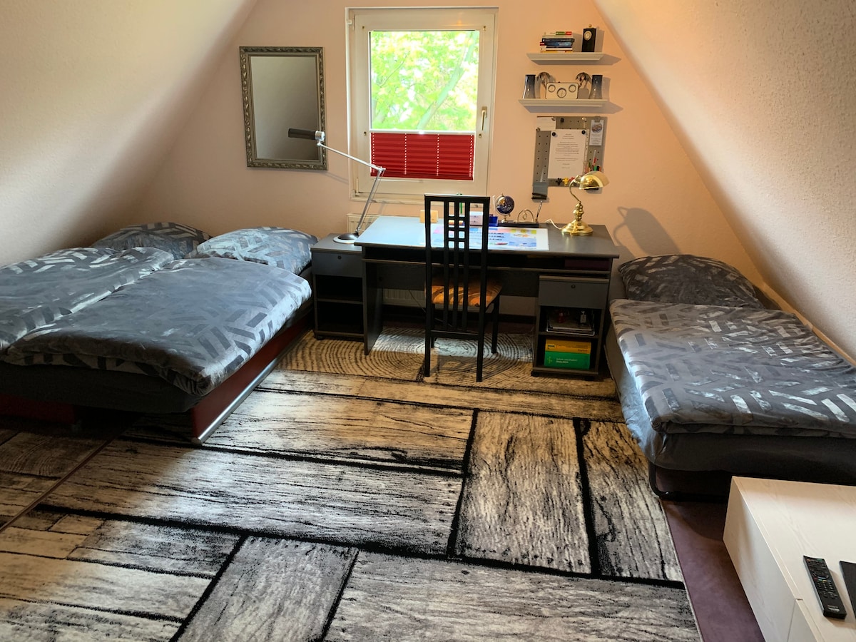 Our place is a single-family house in Lohausen, close to the airport and trade fair, with converted attic. Here you will find a double room (for 2 people) suitable for three people through an extra bed and a single room, which can also be used as a double room. Both rooms share a bathroom with shower and toilet.