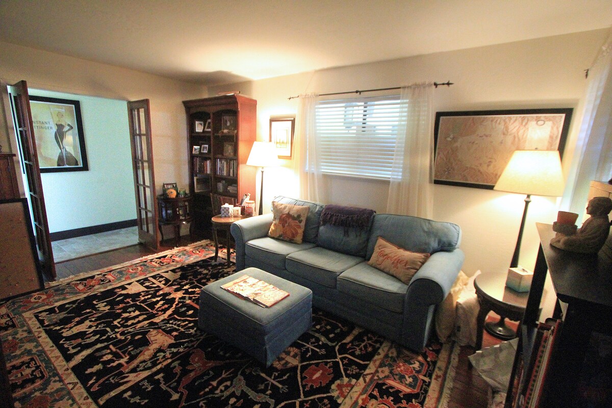 The living room invites you to kick back with extra-deep sofas, a recliner, a 70" smart TV, PlayStation 4, a large library of books, and a cozy corner office. The triple-bay window looks out to ancient oaks and eucalyptus along the seasonal creek.