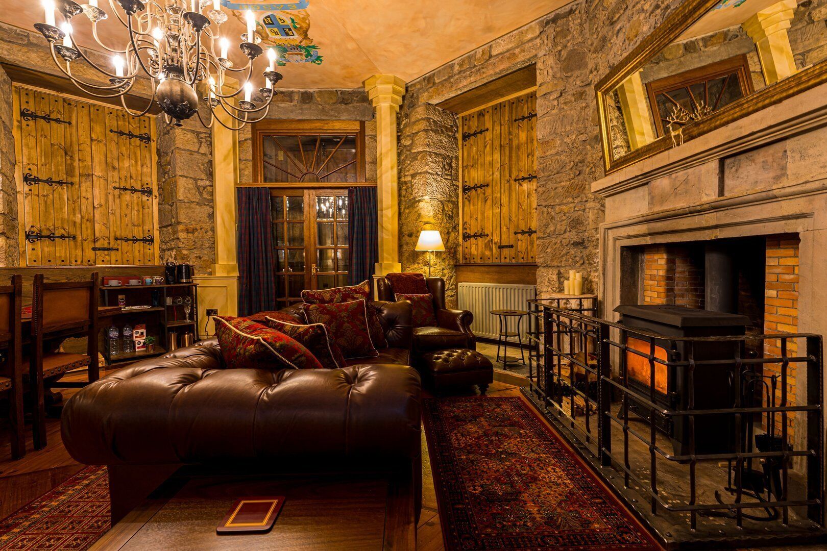 The property has two floors. There's a sumptuous living space on the ground floor featuring a large log fire, elegant leather furnishings, a dining table and a cabinet.