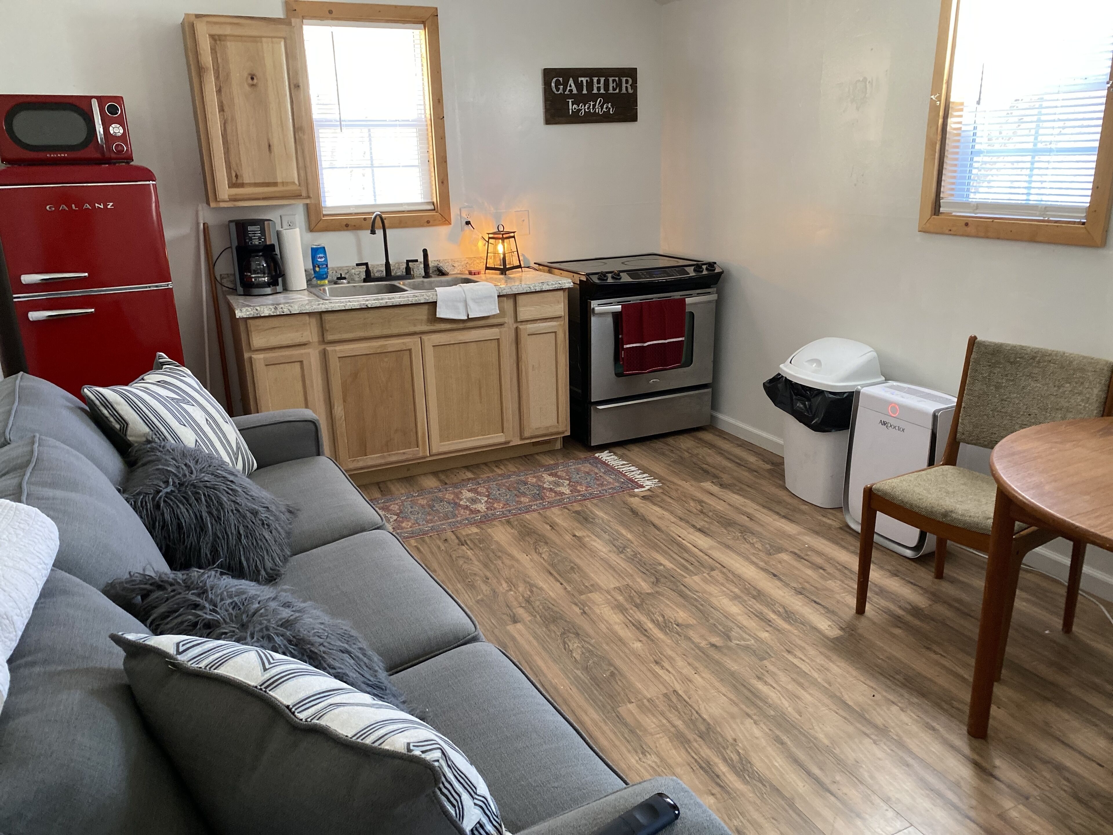 The unit is the 2nd floor of a 3 story older house. The master bedroom has a queen bed, couch, TV and small dresser. The 2nd bedroom has a full bed and couch. The galley style kitchen has a new electric stove, refrigerator and microwave. A Kureig and coffee station are provided. The private bathroom offers a shower. Access requires climbing steps. The property is near the train track which runs through the middle of town.