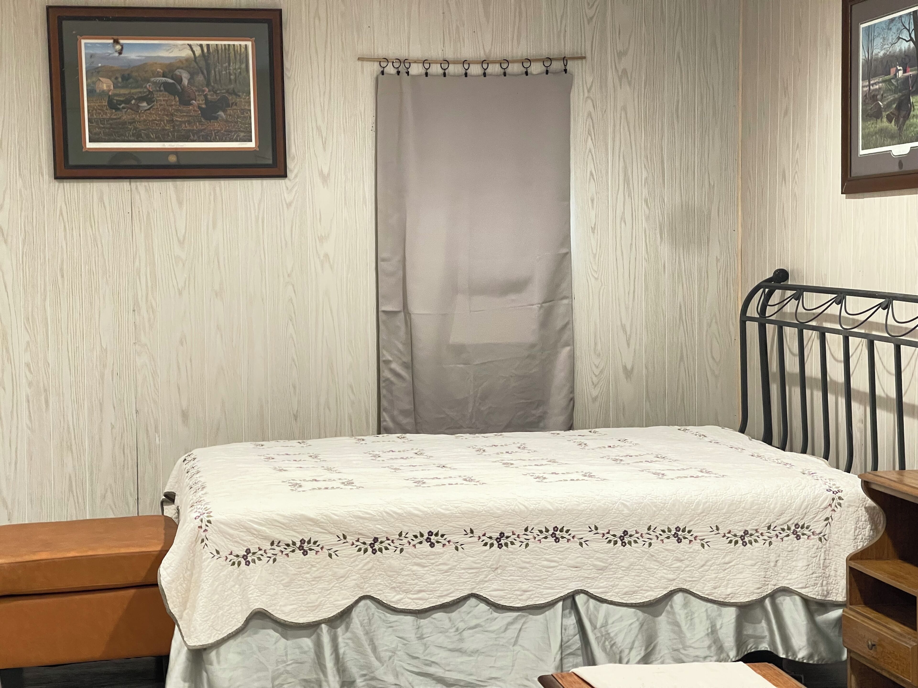 Walkout basement has 2 twin beds, futon couch, and TV. I am not listing this as a separate bedroom. Basement is completely remodeled. There is a full bath located on this level. This is a walkout basement with its own access to outside/patio. The washer and dryer is located on this level as well. there are 2 TVs in the cabin though not pictured.