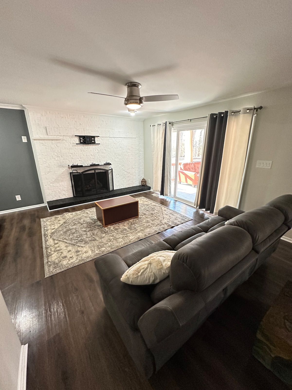 The spacious living room has a fireplace, a new 65” Samsung smart TV, two new couches and coffee tables. One couch is a pullout couch bed.