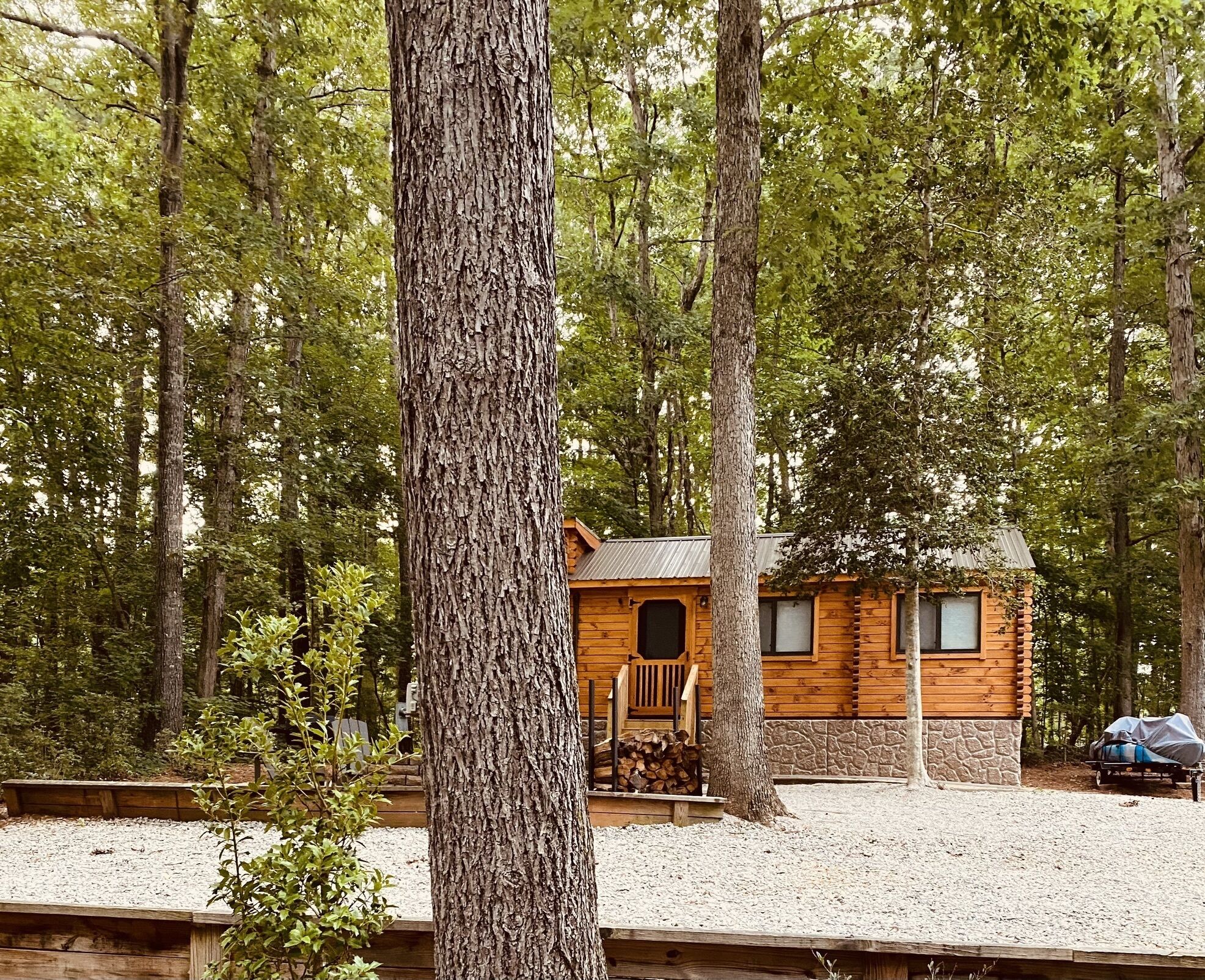 - "My sister and I stayed here while traveling to a 5K event. We had never heard of this town before and were pleasantly surprised at this place. The cabin gives you the feeling of being out in the woods camping, yet it is secure which we appreciated as the guys didn't come along with us this time. It's on a large property close to downtown, but you'd never guess that while sitting on the front porch drinking your coffee. The little fridge holds much more than any hotel fridge we've ever dealt with (a case of bottled soda, two bottles of wine, 6 waters, and more food than we needed) and the bathroom is up-to-date and spotless (something we don't get camping)! We have no reason to go back to this town as we don't know anyone there but we are already planning a trip back just to check out the town a bit more....we'll bring our families with us next time. Can't wait to have a fire and cook hotdogs and smores out front and there is plenty of room for little ones to run around. There are a few more restaurants we'd like to check out there too. So glad we ended up here! The owners are quick to respond to questions also."