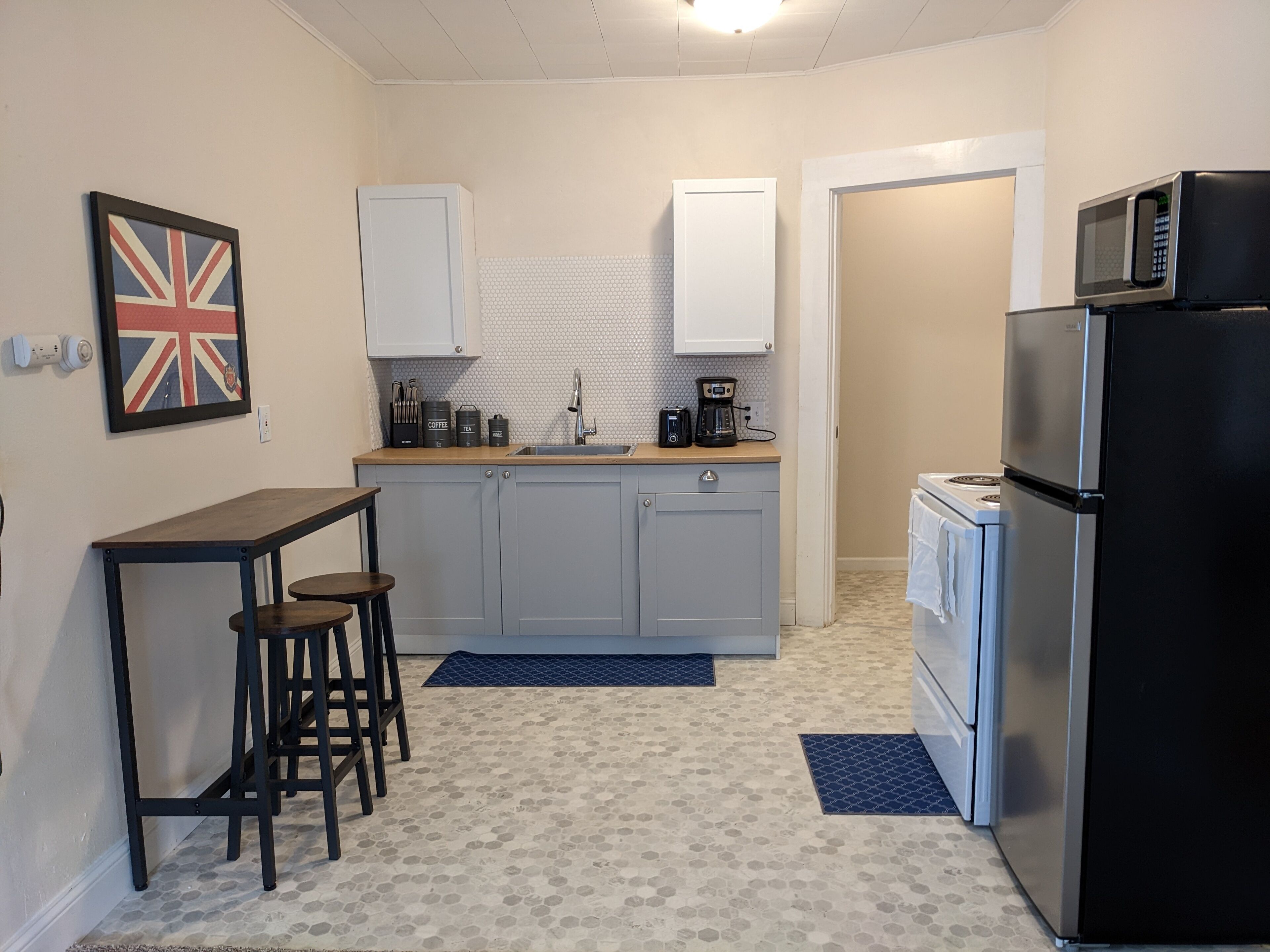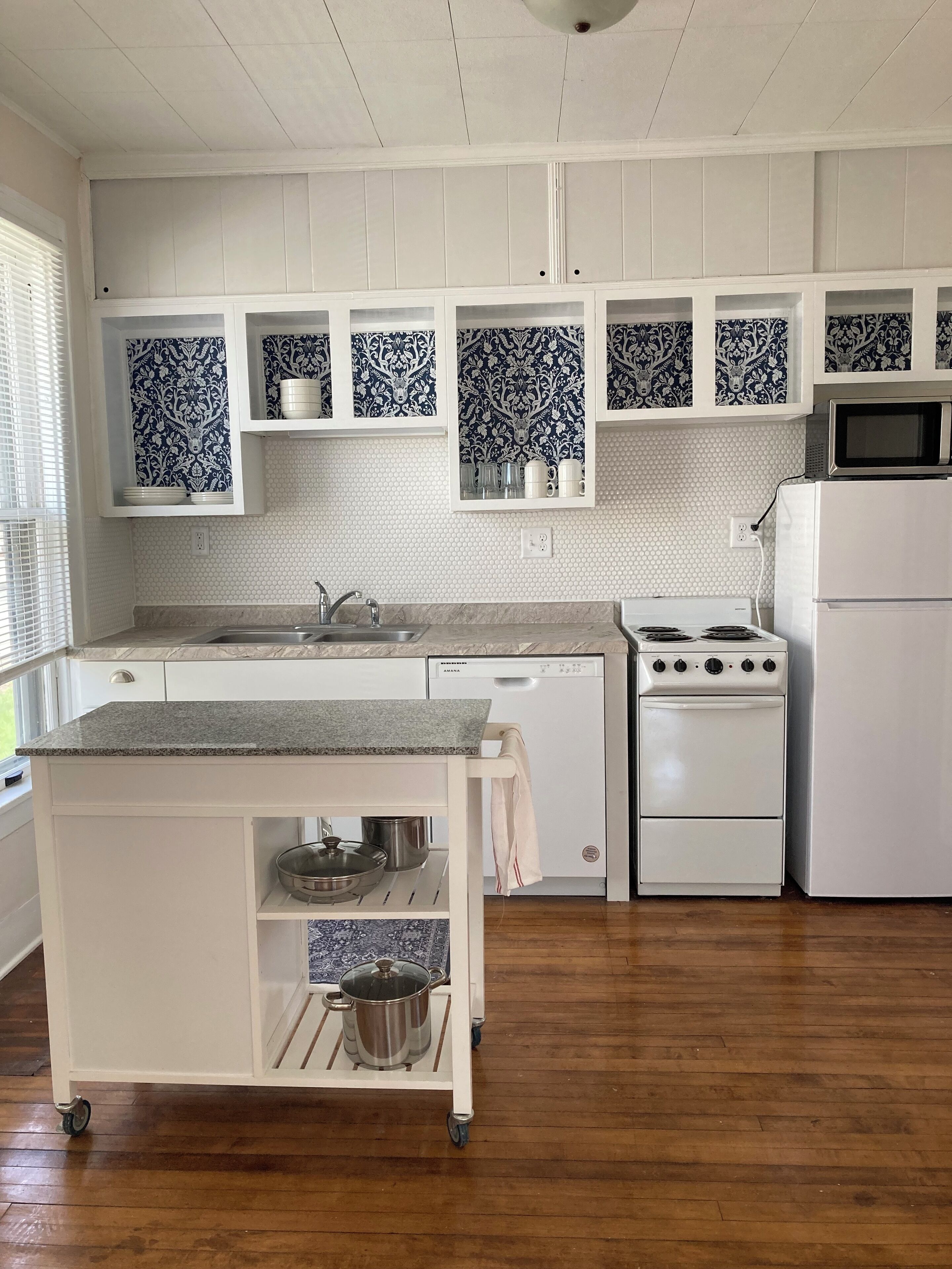 KITCHENETTE: Cooking basics, Keurig coffee maker, double-burner cooktop, microwave, refrigerator, air fryer, toaster, dishware & flatware