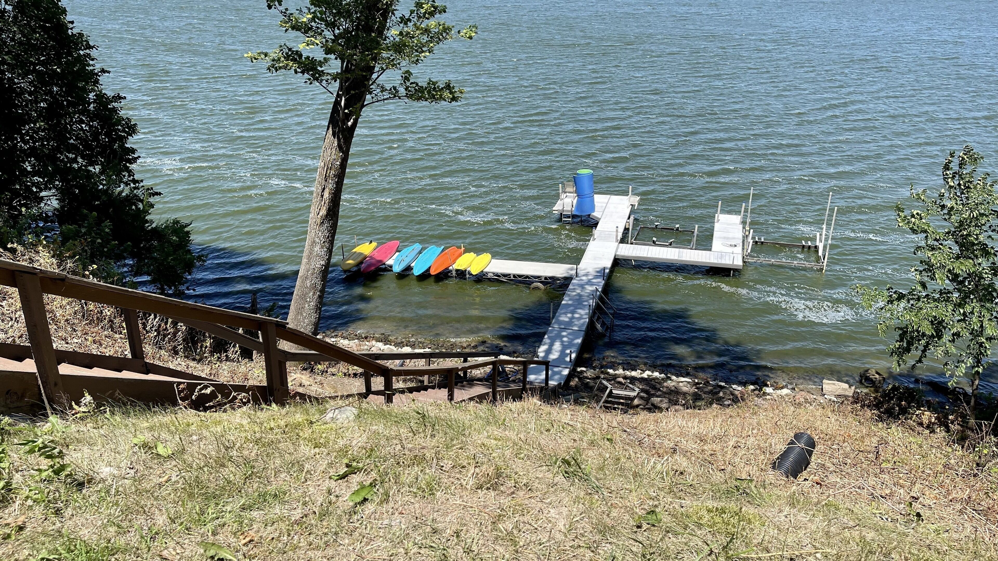 A nice gradual walk (no steps) to the private lake shore where there is green grass area to relax, as well as a nice sandy beach with both full sun and shade trees (which can also hold the 3 hammocks we have for you to use) with a stone wood burning fire pit and chairs as well as a private dock with swim up ladder and bench to enjoy the lake where we also have a free standing lake slide in the water, 6 kayaks, a 5 person pedal boat, floaties and tubes for you to enjoy your time at the lake!