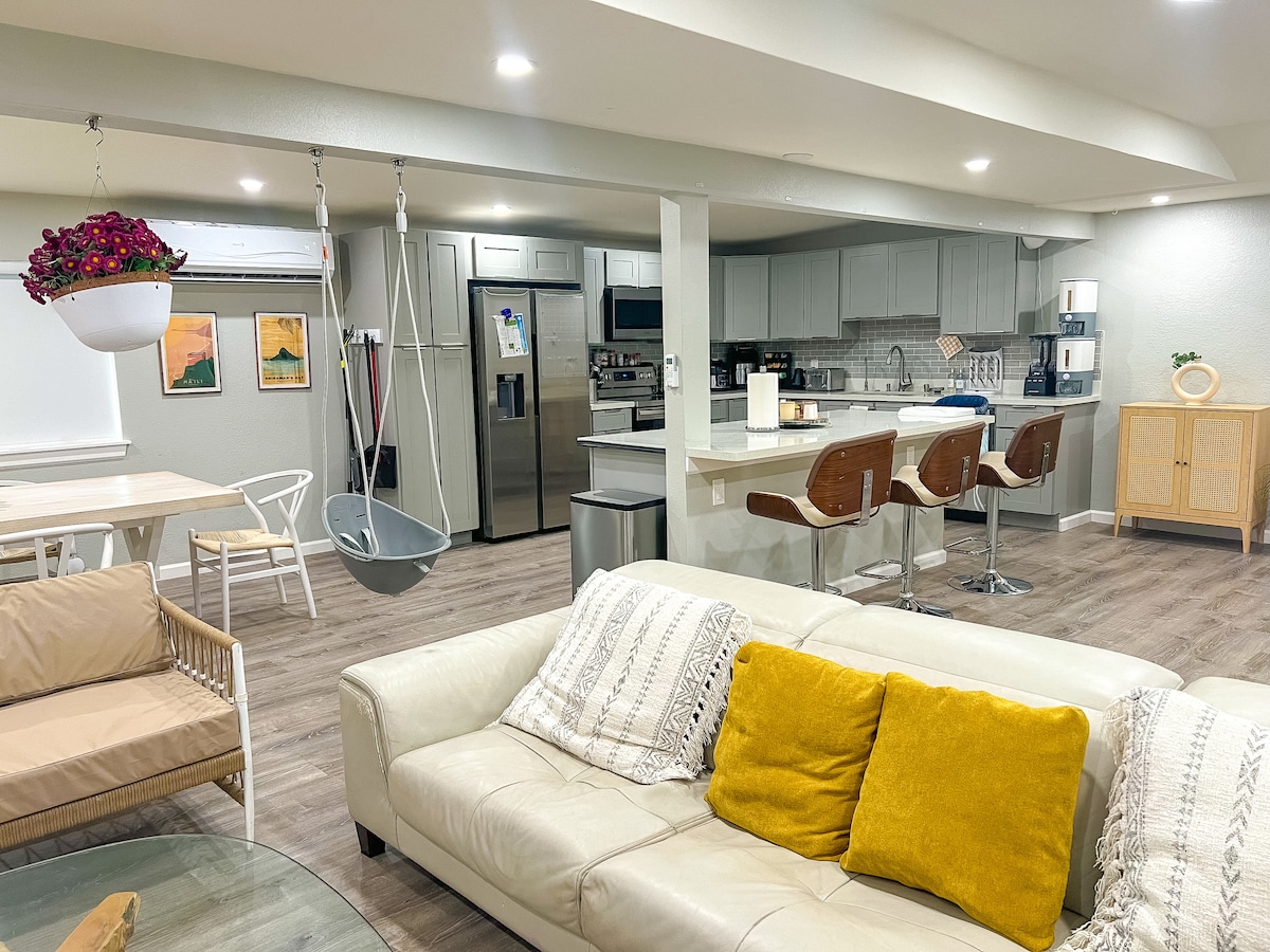 Our property consists of two separate private living units (Upstairs and Downstairs). This listing is for the entire bottom/DOWNSTAIRS unit. This unit can sleep up to 10 people. If more space is needed, two more guests can be accommodated in the living-room area on a “full-size” sofa-bed for an extra fee. The DOWNSTAIRS set-up is comprised of 4 bedrooms (One with a King-size bed, one with a Queen, and two identical rooms with a Full+Twin bunk bed set ups each), 3 full private bathrooms (two indoor and one outdoor bathroom located under our roofed patio), a full private kitchen (fridge, electric stove, dish washer, toaster, blender, stovetop kettle, air fryer, cooking pans, silverware, coffee maker, dishes, and cups). A shared laundry room is available with designated washing days for guests (Samsung washer and dryer), and a shared back yard with a 4-burner gas and propane charcoal grill, and a small play gym for the kids. Additionally, two designated parking spaces are provided under the carport. "This property may not be rented for less than 30 consecutive days. Rental prices will not be reduced or adiusted based on the number of days the rental is actually used or occupied."