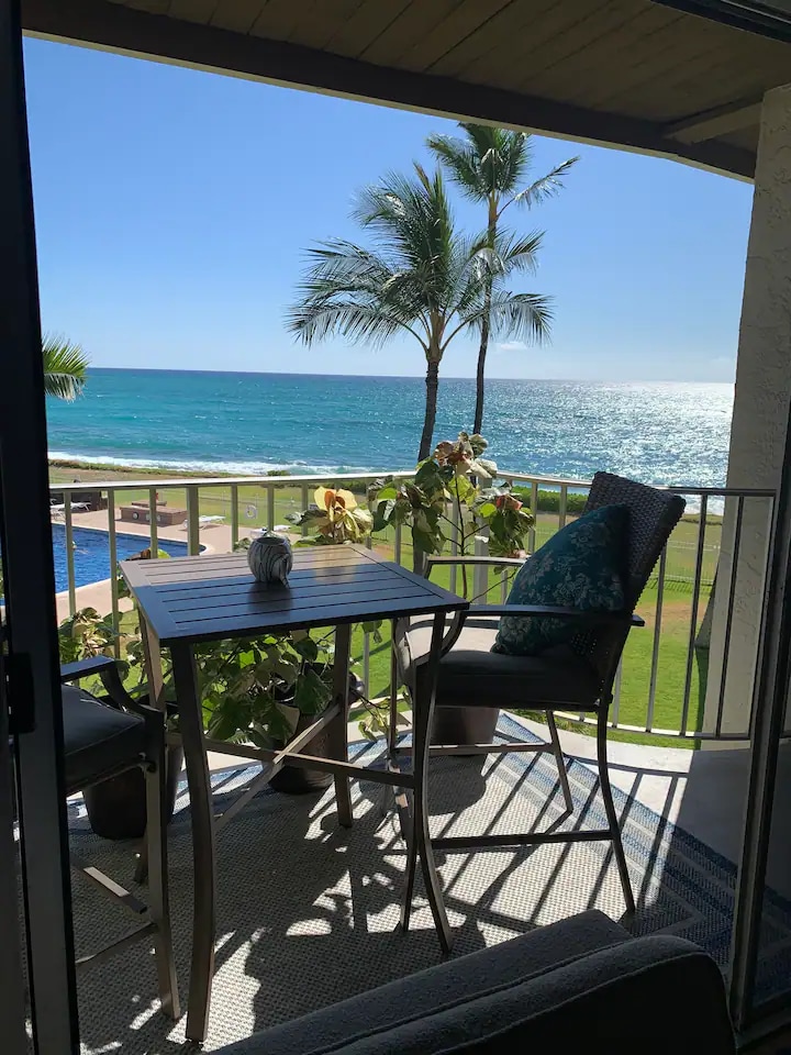 Nicely furnished for comfort. Especially beds. Gormet stainless kitchen and marble bathroom with walkin shower for two. Ocean front lanai perfect for winter sunsets and whale watching. Sleep in the king bedroom with air conditioning or in the queen wall bed looking at the ocean, beach, sky, moon and more. Heaven to wake up to before coffee on the lanai.