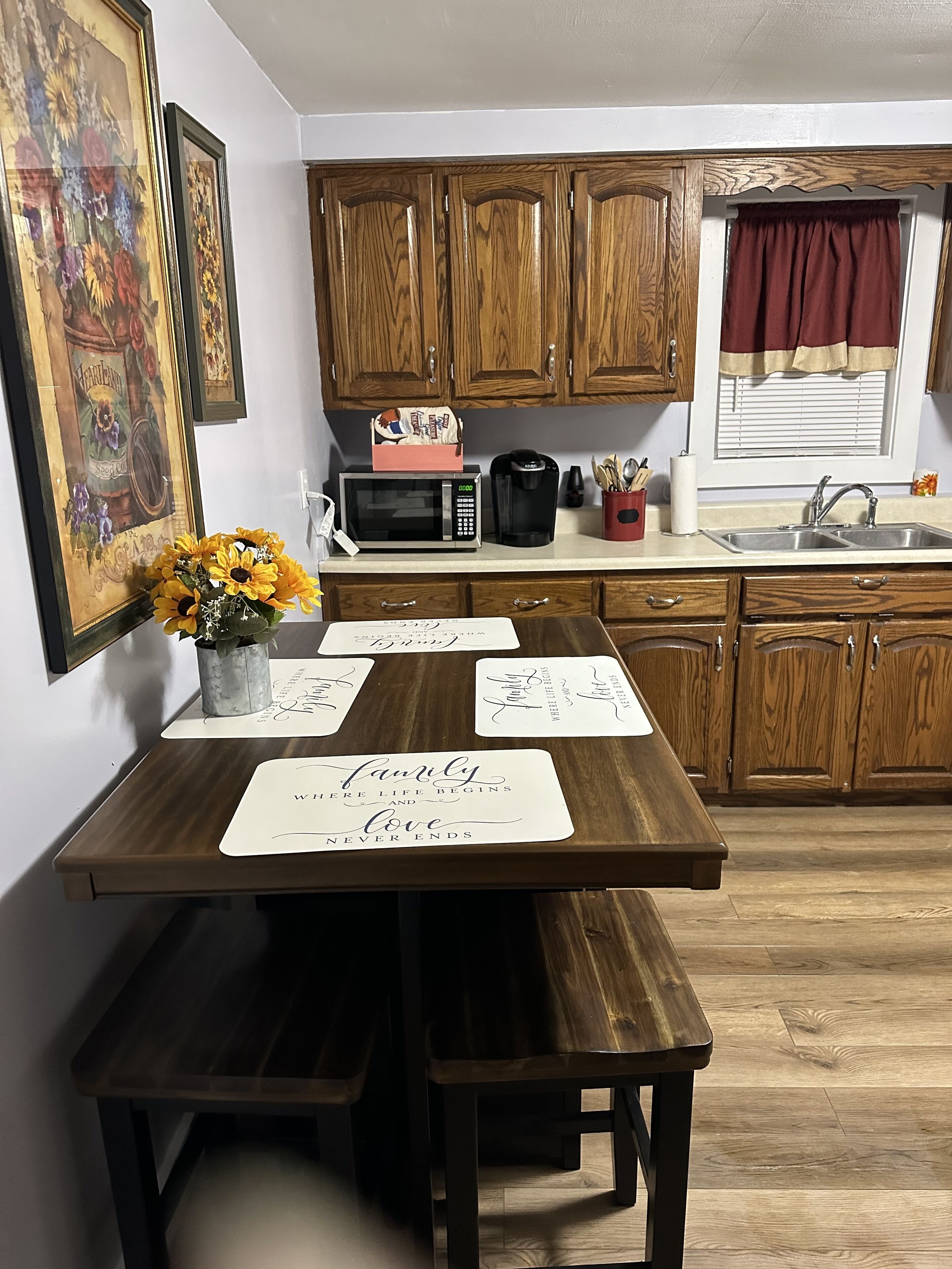 - "We stayed here with our family of four, and loved EVERY MINUTE! The property sits just minutes outside of the main town, perfectly situated! Located on an expansive and quiet plot of land, you have beautiful fields surrounding the home, friendly neighbors, and tons of privacy! The house has 3 large bedrooms, all with very beautifully decorated queen beds that were super comfortable! The bedrooms are large enough to support any extras your family may need to bring along (playpen, etc), and we were even surprised to see they also provided a toddler bed & crib/changing table combo for us to use! Plenty of closet space, large comfortable living room, beautiful dining room, & a full size kitchen! Laundry, 3 full bathrooms, and an adorable fully stocked coffee station provide everything you could need to be comfortable here as a couple or as a large family! I would happily bring the grandparents or extended family along for our next visit!! Everything was very carefully considered, and very well planned out. The owners clearly put a lot of attention into making guests comfortable; tons of outlets, lamps in every room, TV, wi-fi, and even ice in the freezer! I know these seem like small things, but when you travel with small children, these tiny touches make all the difference. Our favorite part was sitting on the large attached front porch at sunset, and just chatting and enjoying the view! DO NOT MISS THIS HIDDEN GEM! We took a chance on this newer property, and LOVED IT!!!"