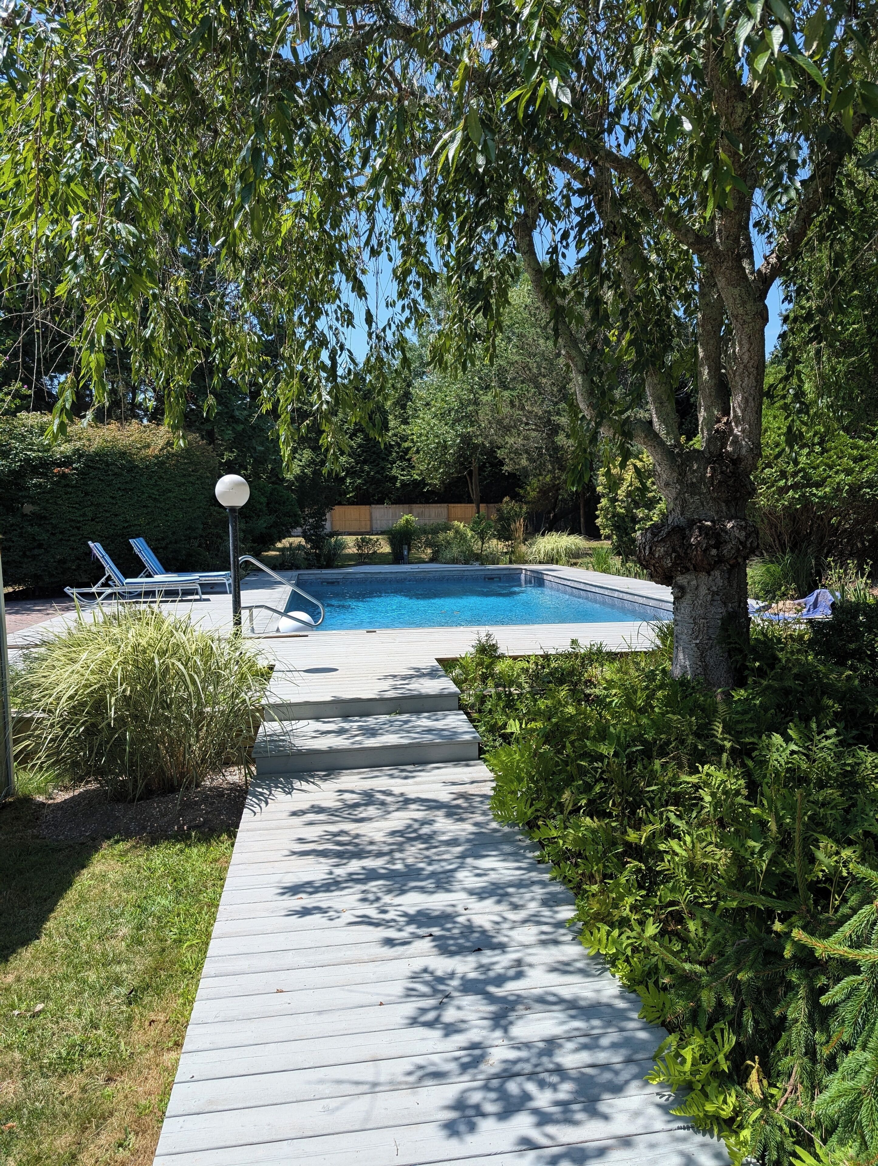 Relax at this charming and historic summer cottage on a picturesque, quiet street. Two bedrooms, one with a Queen size bed and en suite half bathroom and the second with a bunk bed (Queen on bottom and twin on top) and en suite full bathroom. The house also features a den with en suite full bathroom and a spacious living and dining room. Kitchen includes all standard appliances, is fully equipped, and also includes a dishwasher and coffee maker. High speed wifi and dedicated work space are excellentfor remote work! Enjoy a huge backyard with a massive pool, lounge chairs, couches, outdoor dining, a BBQ grill, and an outdoor shower.