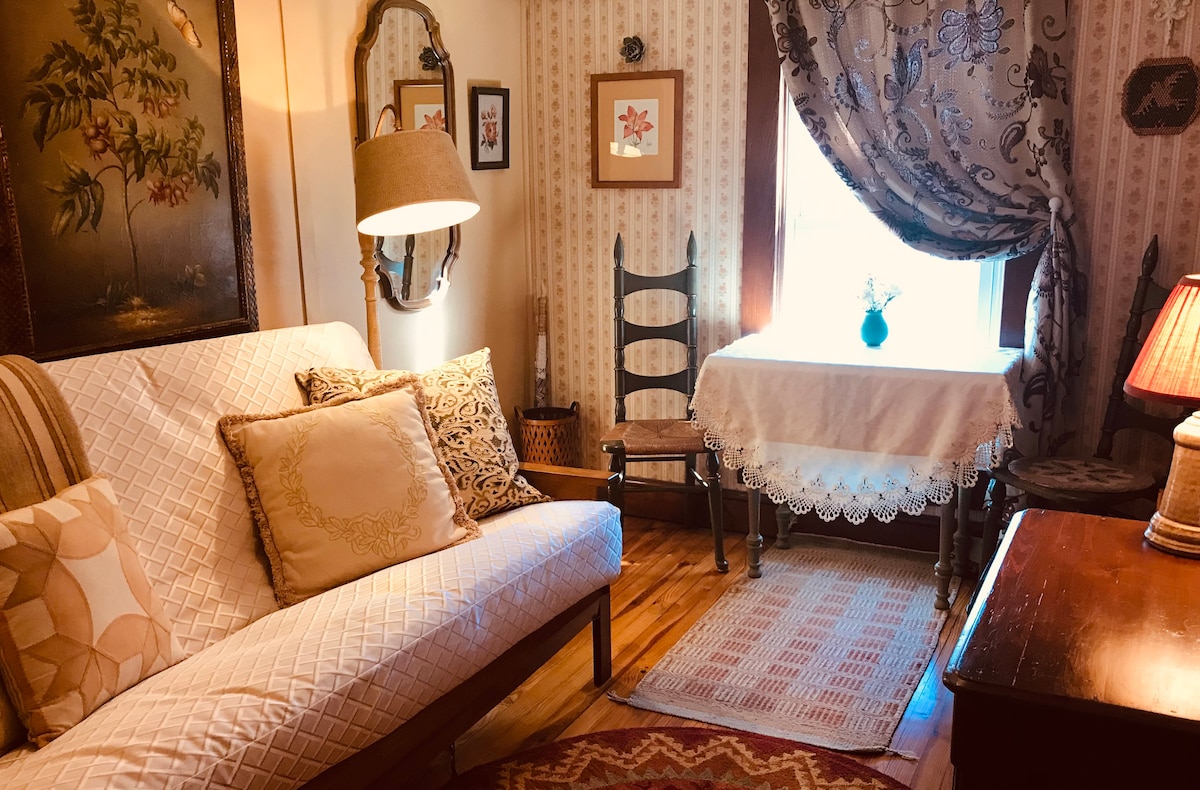 The upstairs accommodation is all yours and is accessed by passing through the main level of the home. A very narrow, steep and twisty old-timey staircase leads to a vintage-styled, romantically decorated bedroom with fresh flowers, comfy sitting room, and a very large full bathroom filled with amenities. NOTE: The upstairs area has ceilings that measure from 6’3” to 6’ 8” depending on where you stand. The feel of the charming, cozy rooms are like a step back in time. NOTE: The home does not have central heat or air conditioning to the upstairs, but guests find the rooms very comfortable. During winter months, wool blankets are available. Electric blankets and heaters are also provided, altho’ guests report no need for them. In the summer, there is a window unit in the bathroom that cools the upstairs as long as the doors remain open. Fans are also provided. NOTE: The turn in the staircase allows for a very private area if you choose to leave the bedroom doors open. Guests love the quaint, antique-style space!