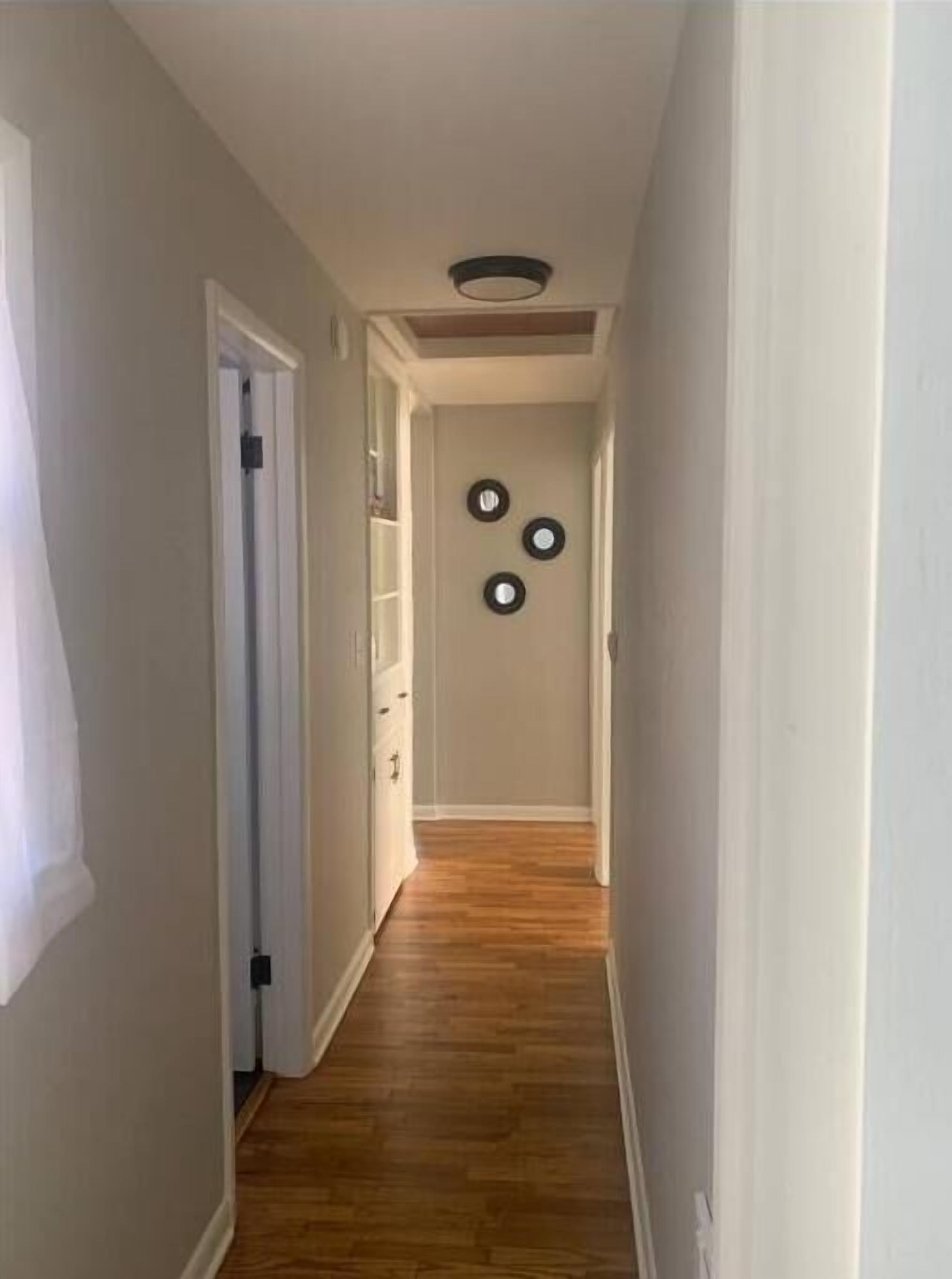 Step into luxury with this newly remodeled 3-bedroom, 1-bathroom house featuring gleaming hardwood floors throughout. The master bedroom boasts a king-sized bed, the second bedroom a queen-sized bed, and the third bedroom two twin bunk beds, perfect for family or guests. The living room is a cozy retreat with a spacious sectional, a 55" wall-mounted television, and a fireplace TV stand, creating an inviting space for relaxation and entertainment.
